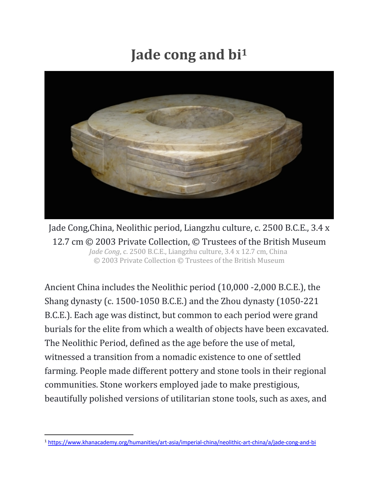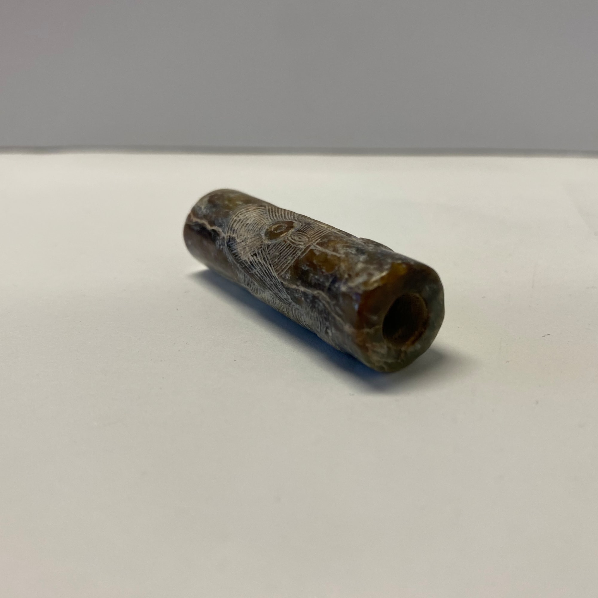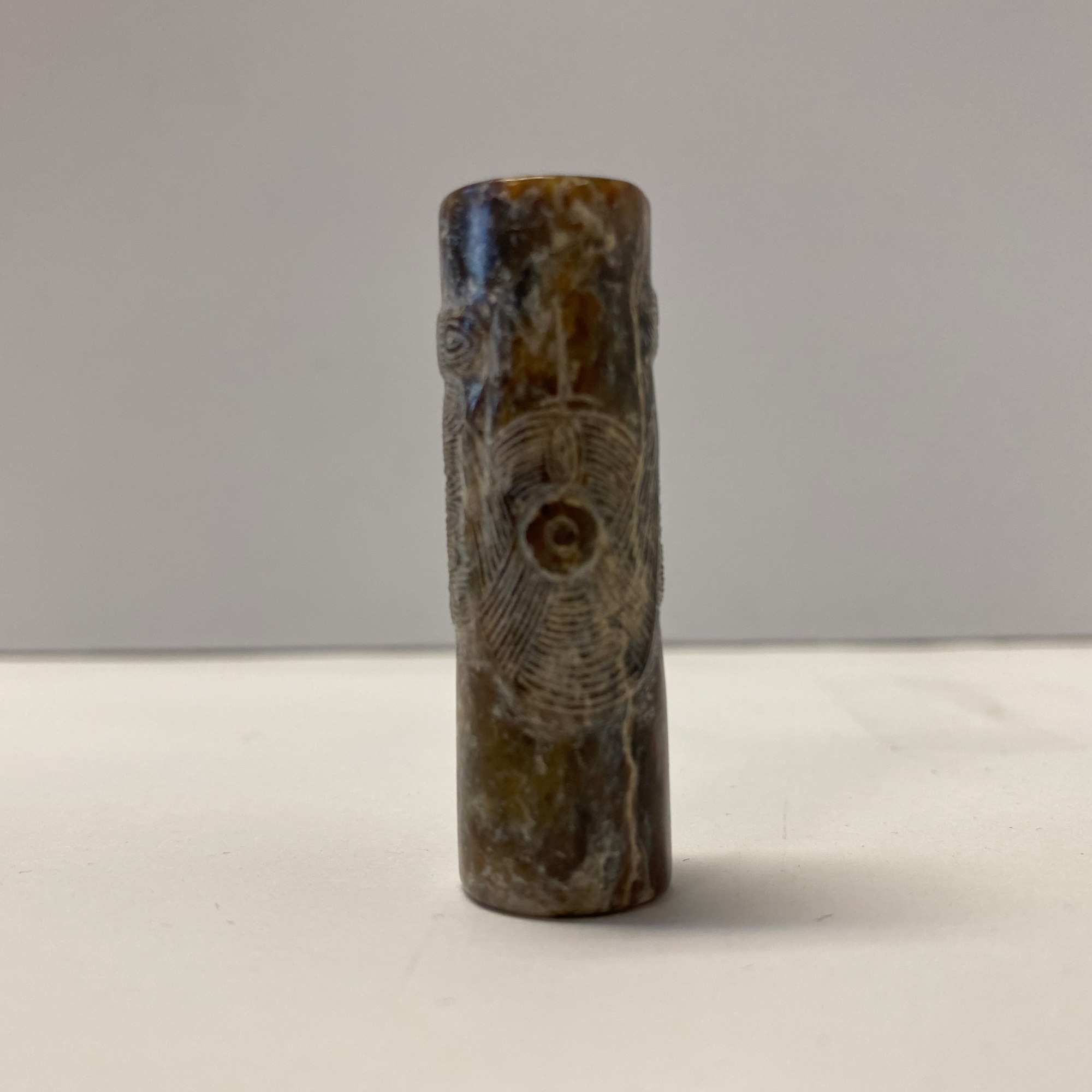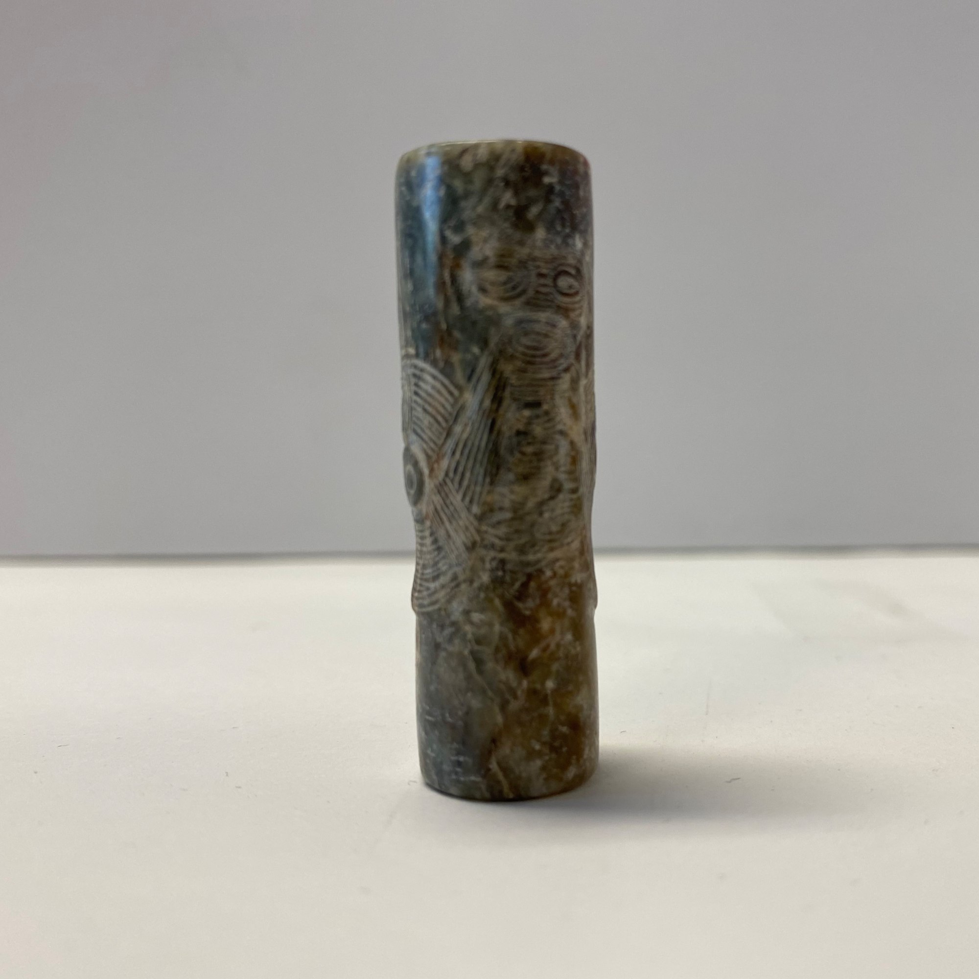 Cong jade sculpture identified as from Liangzhu culture, ca.3300-2200 B.C.E. Stone is blue-green with pale brown sections. Carvings are fine and thin, drawn in circles around figure. Hole drilled length-wise through piece obstructed by dirt.