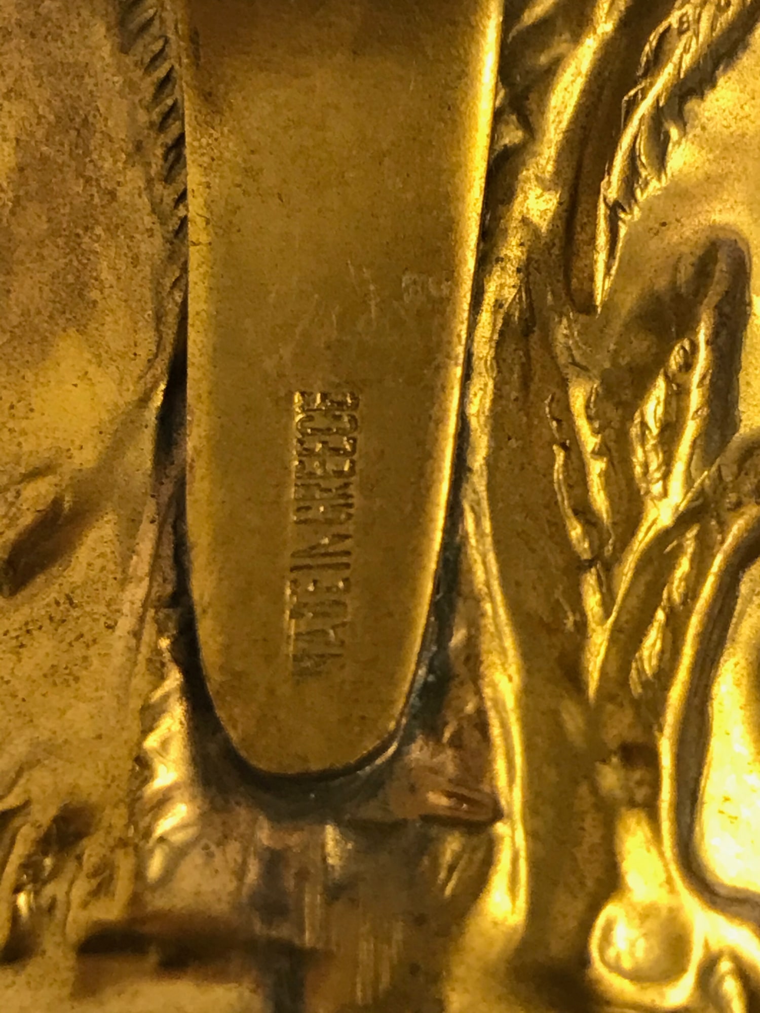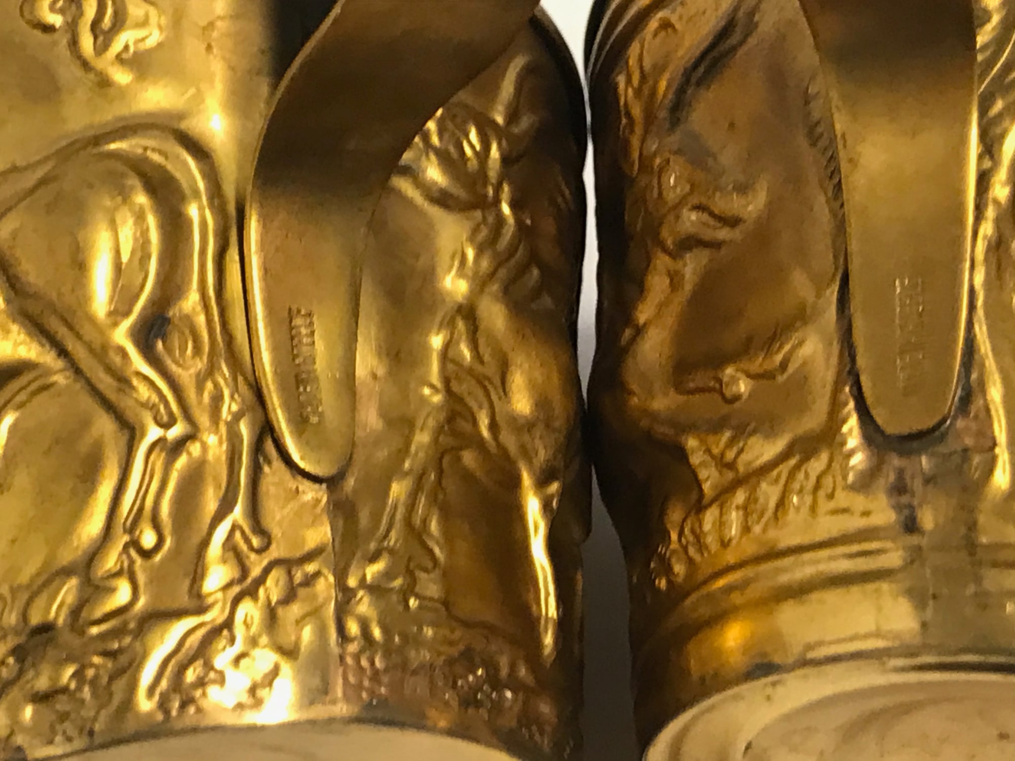 Two shiny metal cups (a) and (b) with scenes in relief depicting bulls. The cups are stamped on the bottom with "Hand Made" and under the handle with "Made in Greece." One weighs 3.6 oz, the other weighs 3.4 oz.