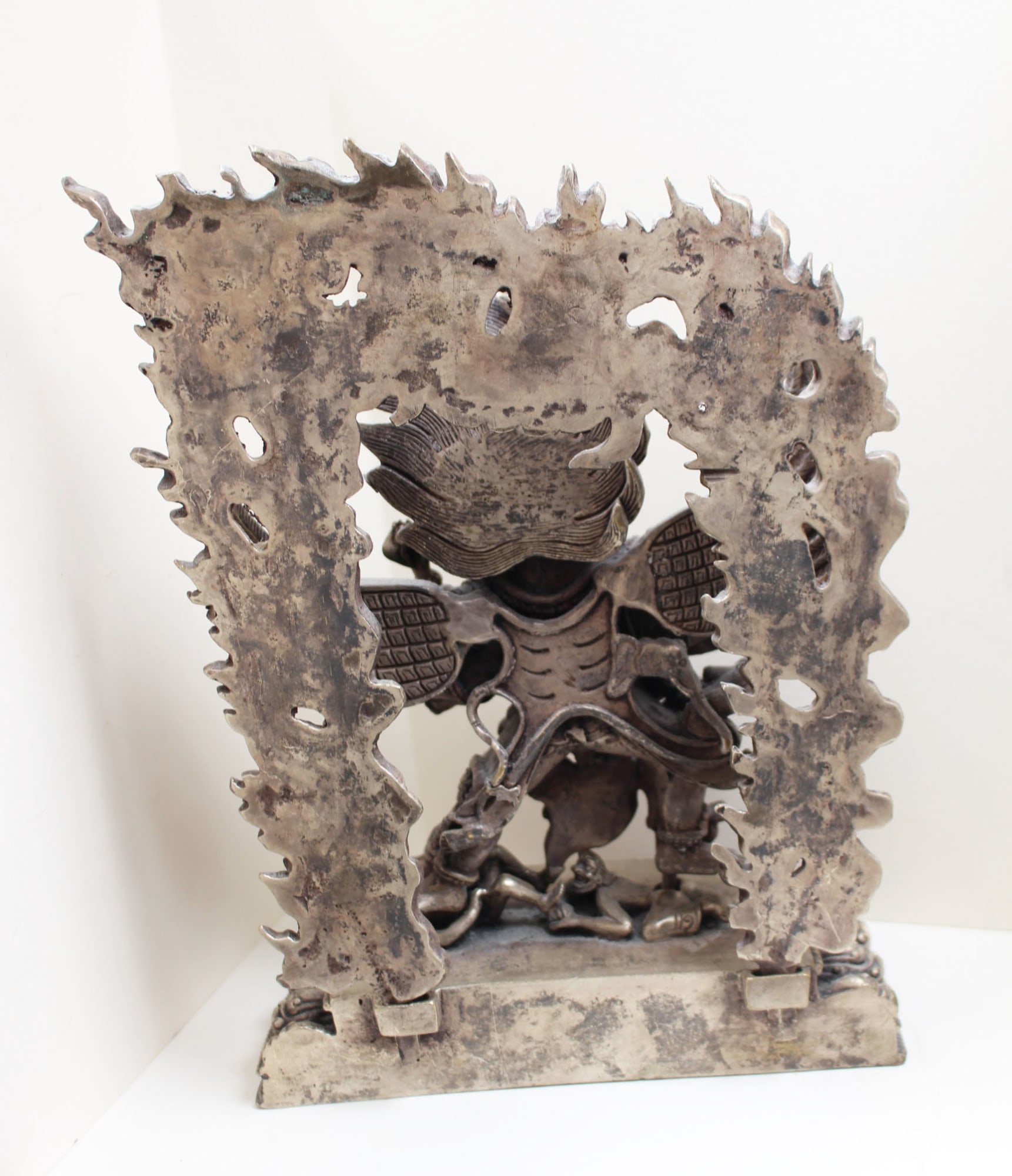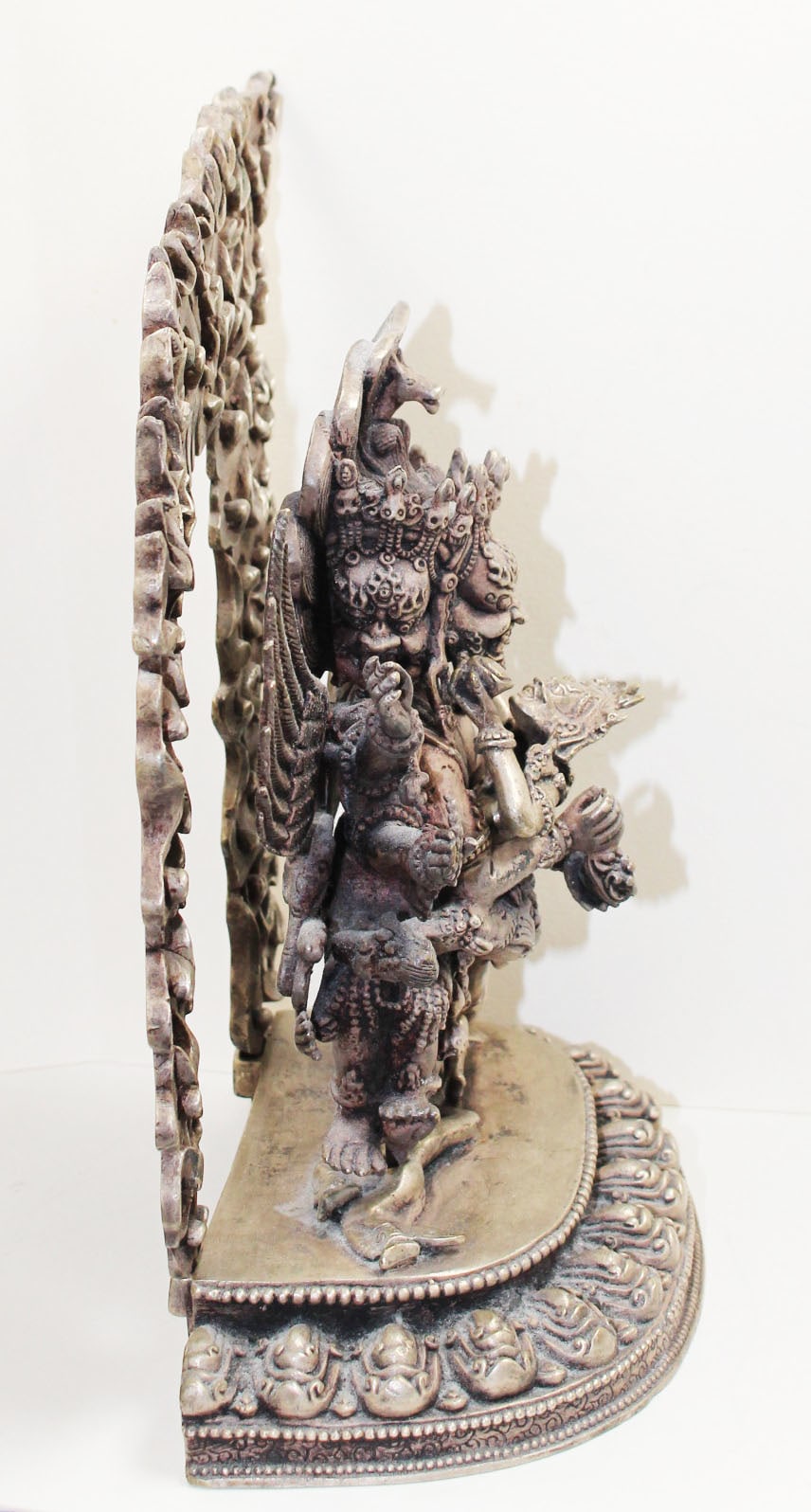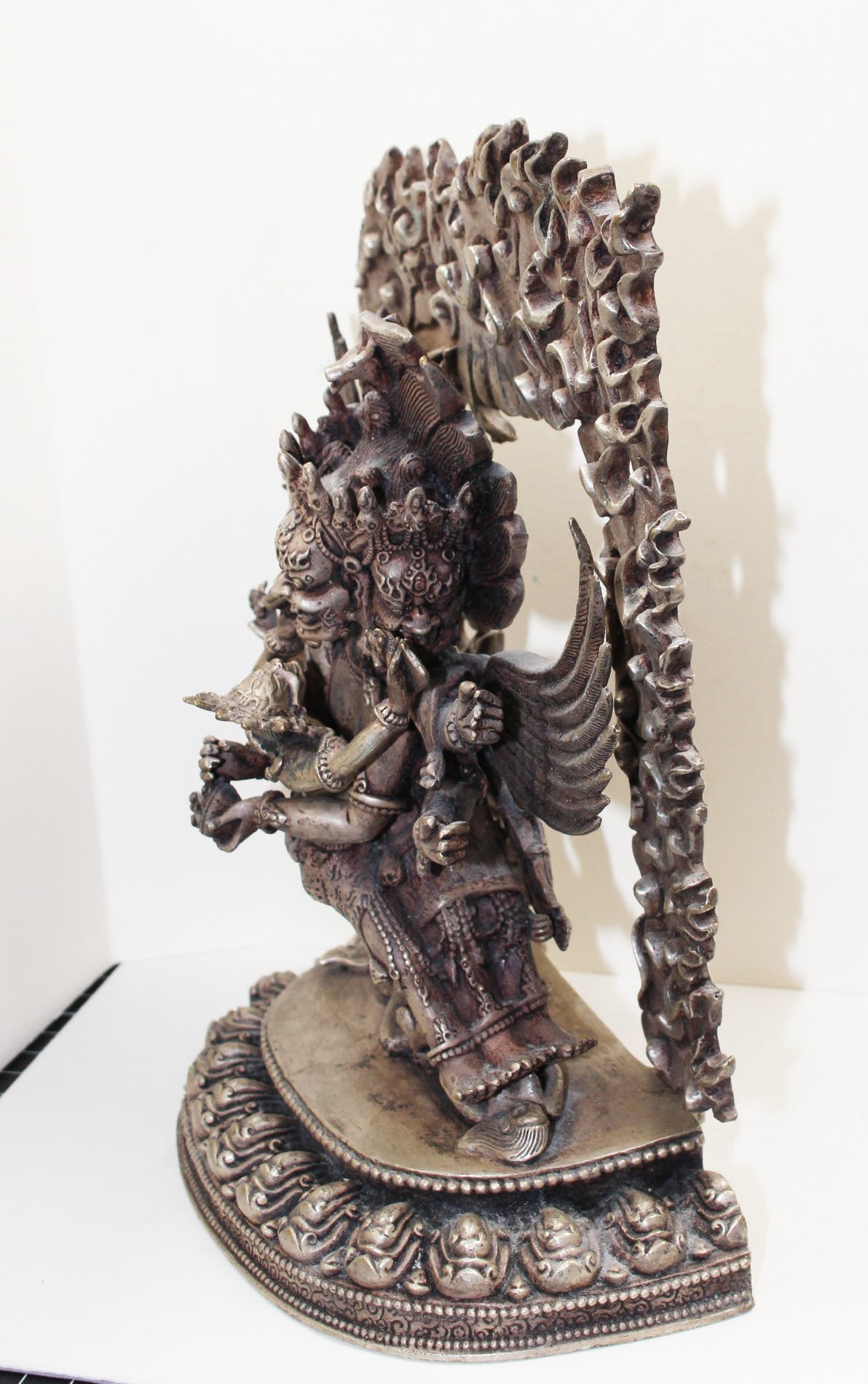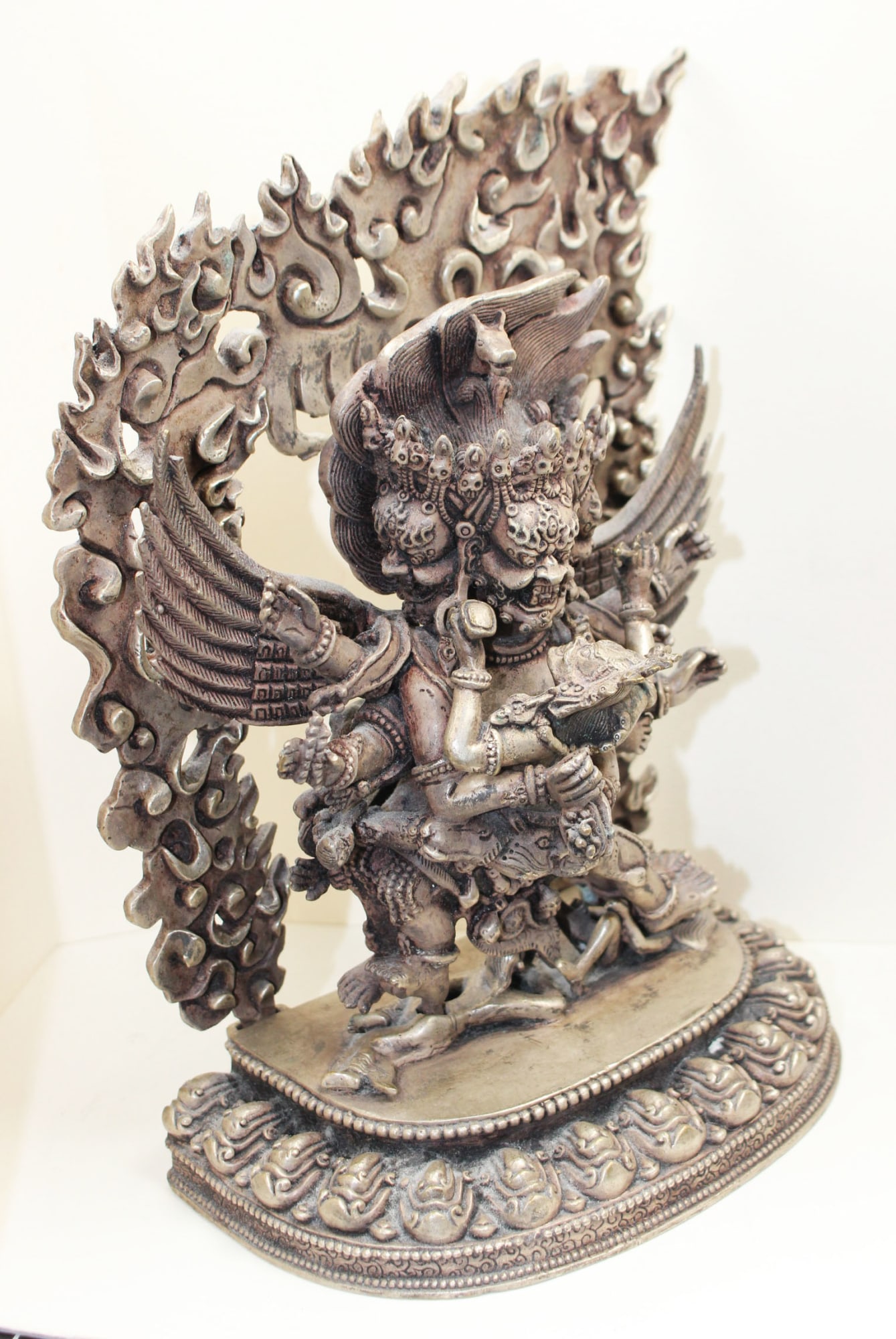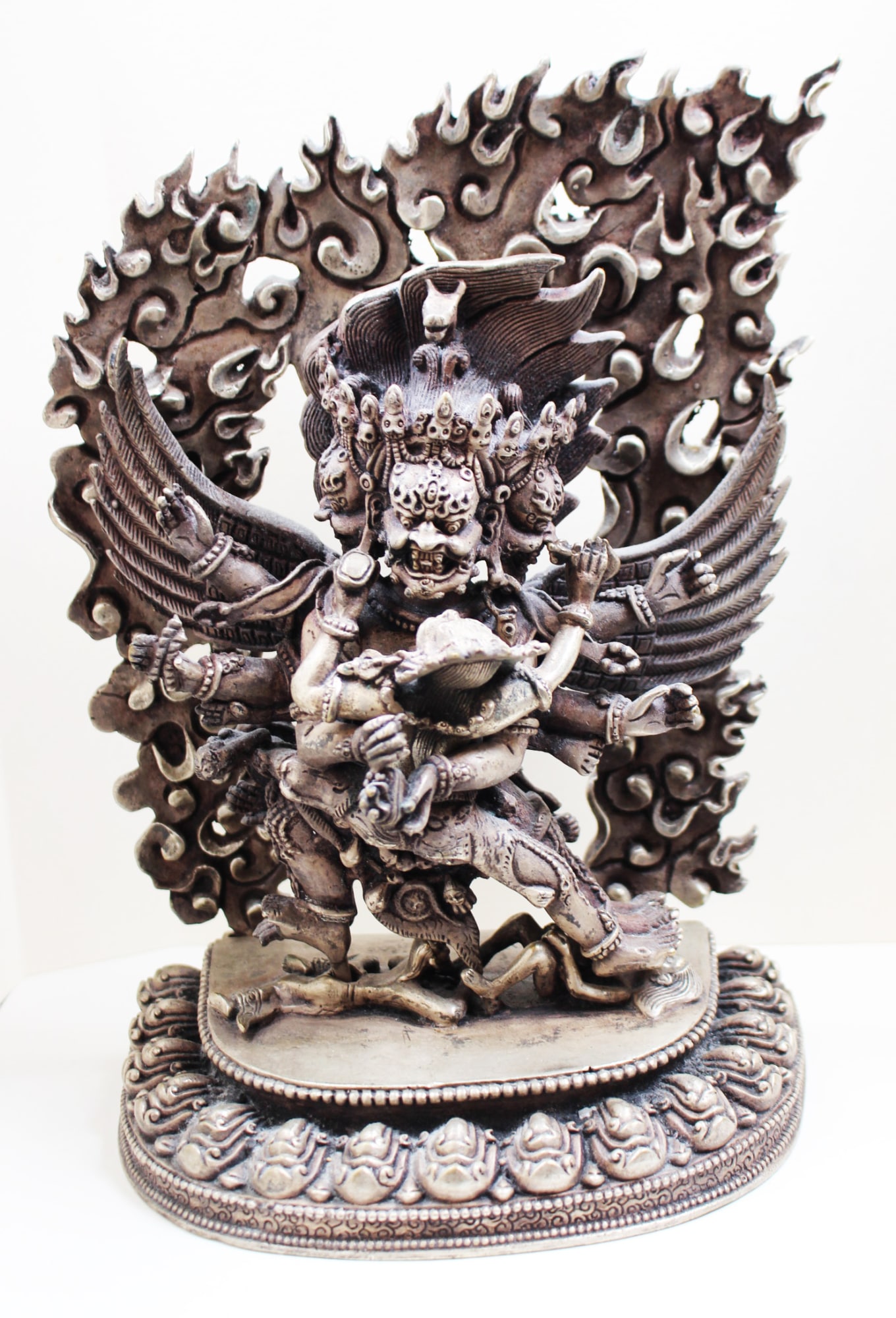 In Tibetan Buddhism, Hayagriva is the wrathful form of Chenrezig. According to the story, Hayagriva was a result of taming the demonic force known as Mantram Rudra and is a symbol of compassion to tame inner self-absorption.