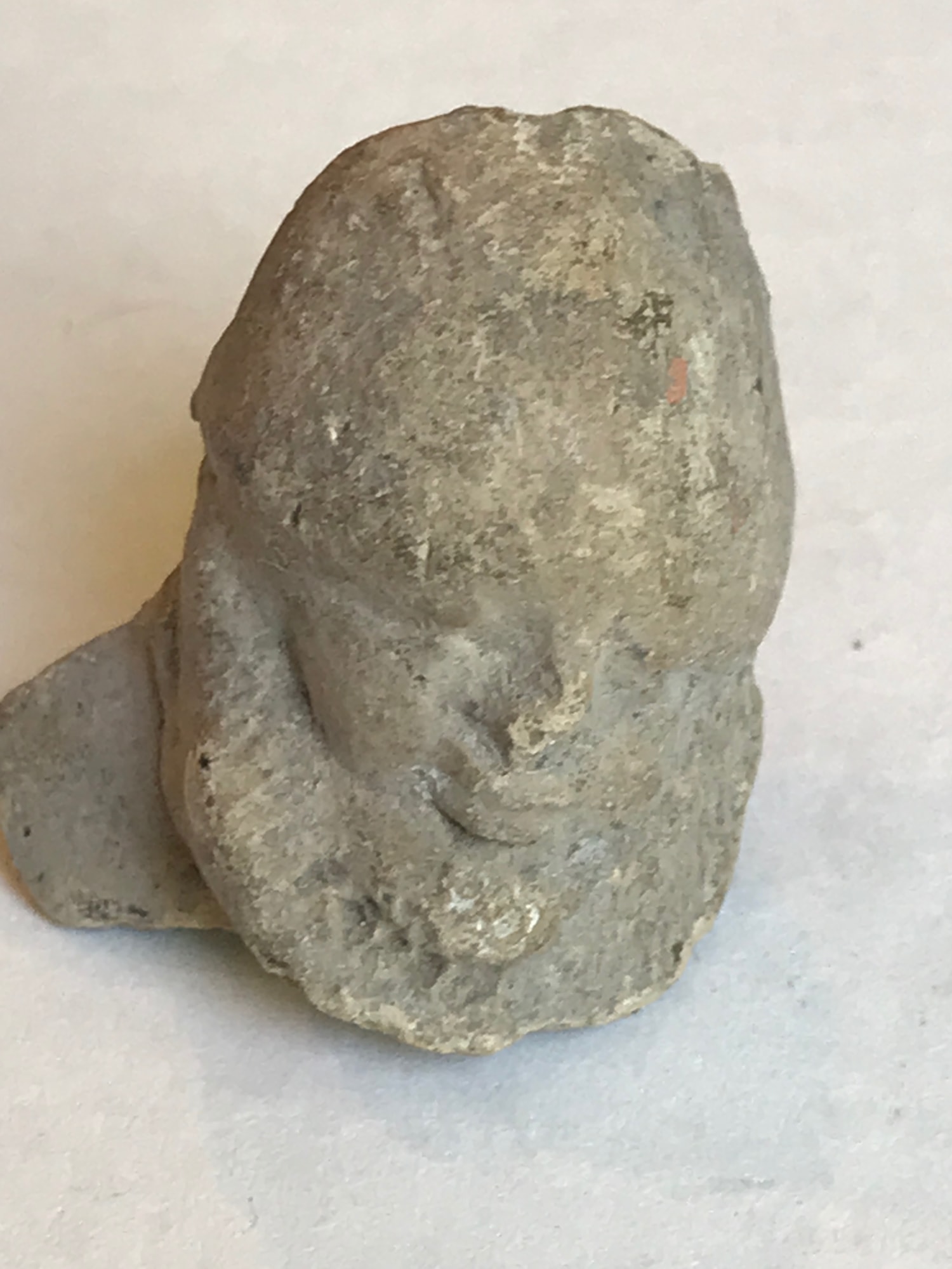 This head has some similarities to Babylonian heads, but it could also be from farther west. Cultural traditions west of Babylon overlapped in various ways. The Hebrews settled in Canaan after the Exodus, then were forced to live in Babylon during the 6th century BCE. The oral tradition among the family that has owned this head for five generations is that it is Hebrew. Further study is needed. It was collected by Judge A. D. Russel, Justice of the Supreme Court of New York, in the 1850s. He had a large collection of ancient art, especially West Asian and Greek. He was Jewish. The head passed down through his step daughter, Mrs. Sidney Cooke Lanier, to her son, A.D.R. Lanier, and then to his daughter, Martha Lanier Graham. (FLG)