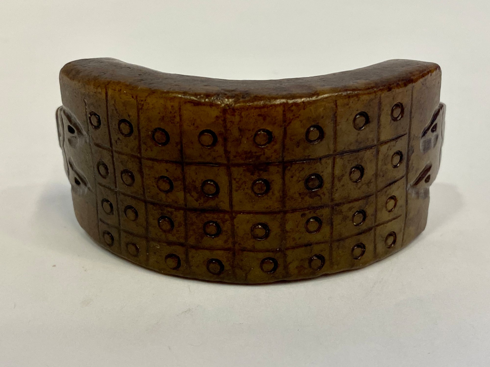 Jade sculpture from the Hongshan culture (4700 – 2900 BCE). Either end of convex sculpture depict animal heads both with ears, eyes, snout, and exposed teeth. Body is adorned with symmetrical pattern. Holes puncture animal heads on both sides through mouth. Stone is deep brown.