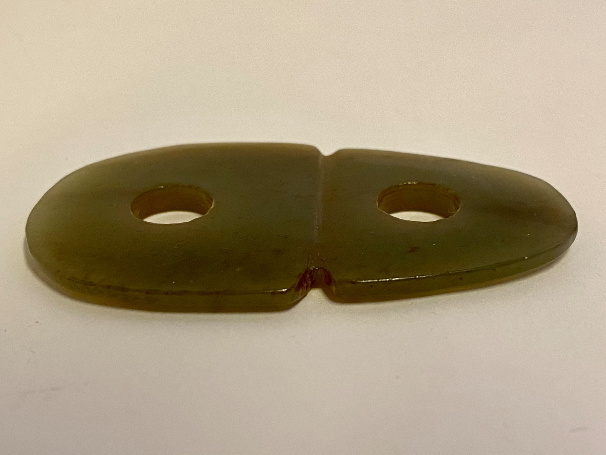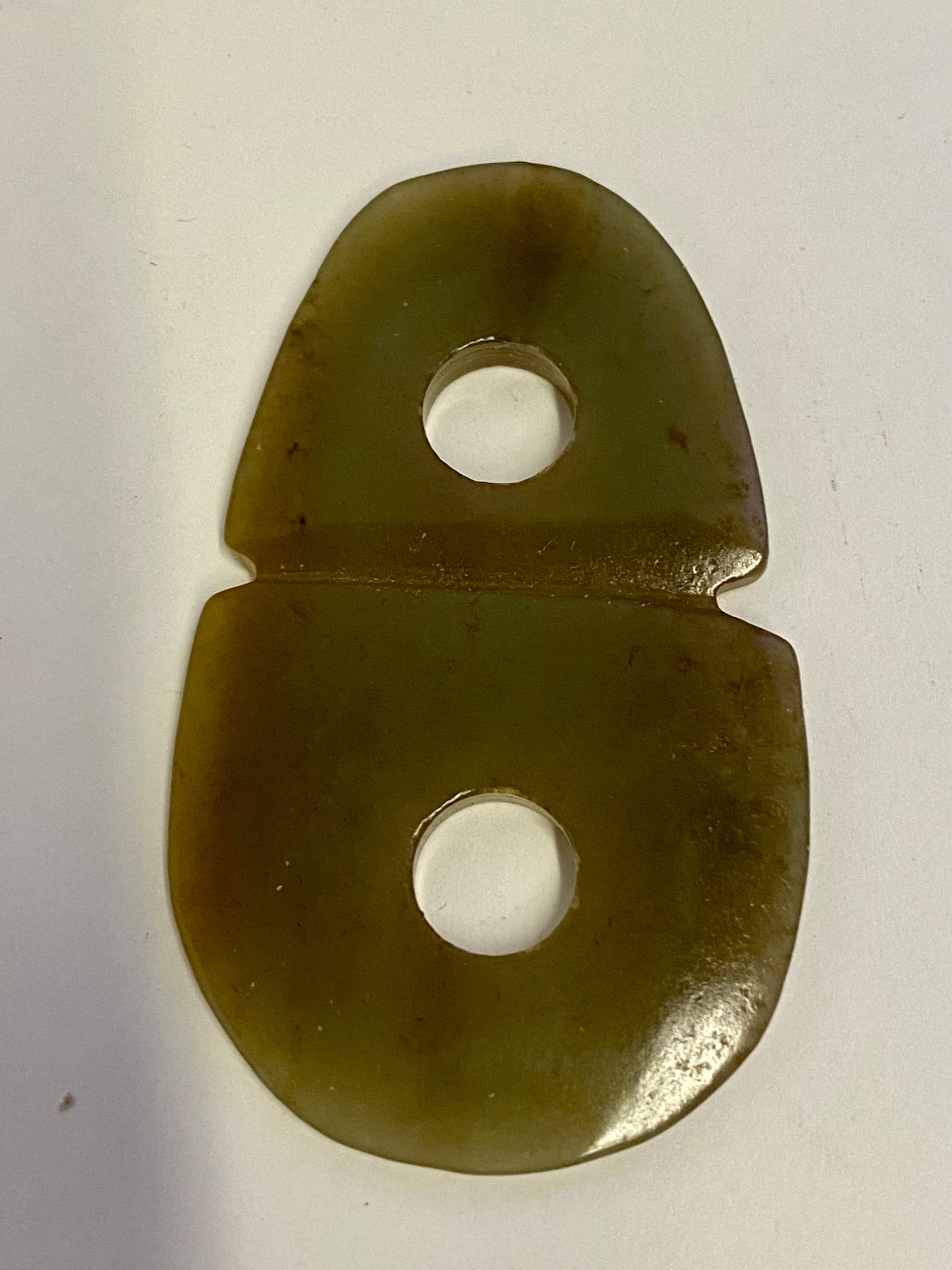 Geometric jade sculpture from the Hongshan culture (4700 – 2900 BCE). Both sections are pierced with a large hole and are of asymmetric sizes. Both sides are the same, flat and unadorned. Stone is olive green.