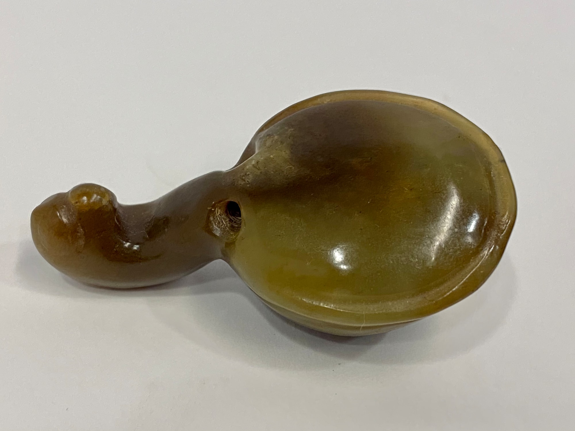 Zoomorphic jade figurine from the Hongshan culture (4700 – 2900 BCE). Creature's head protrudes from body with long, skinny neck. Body is round and unadorned. Hole punctures neck. Jade is deep olive.