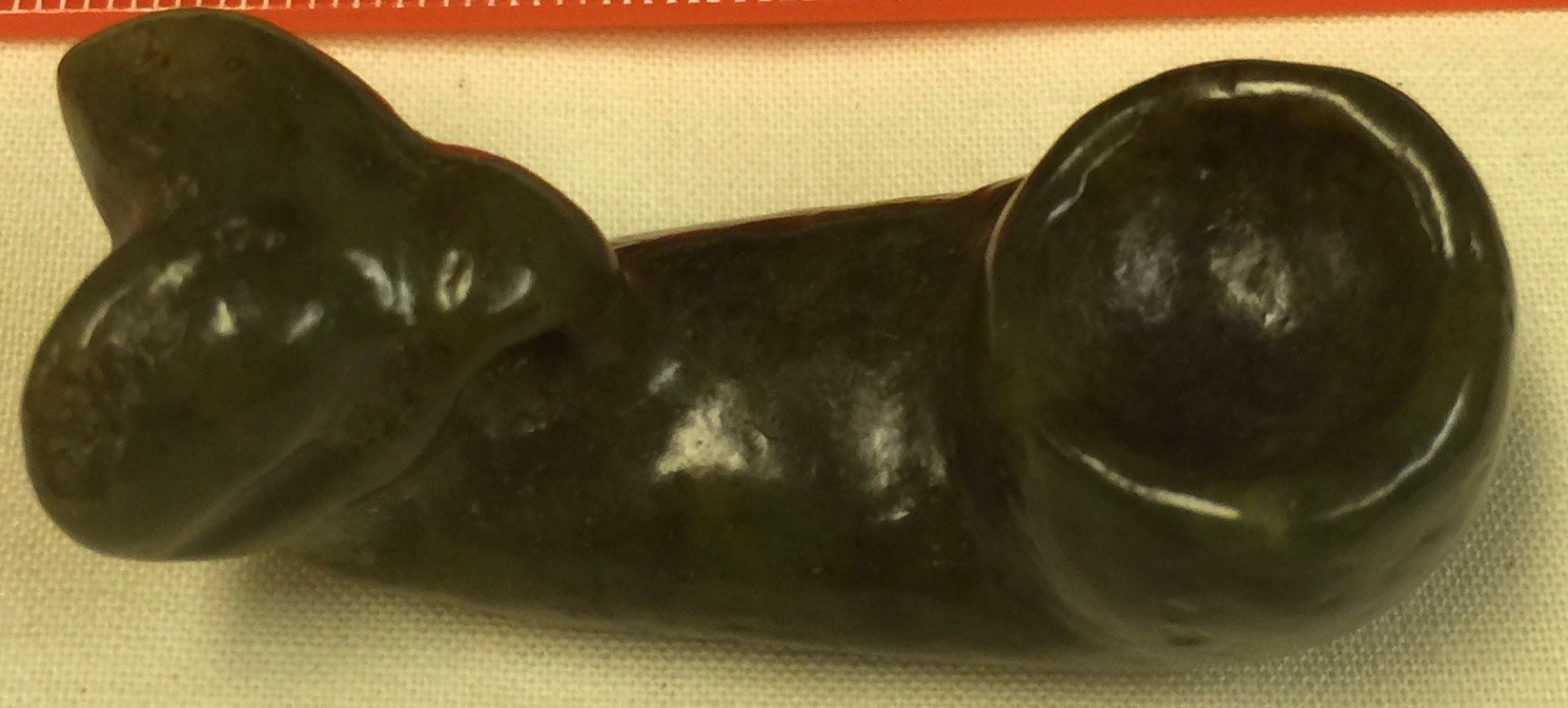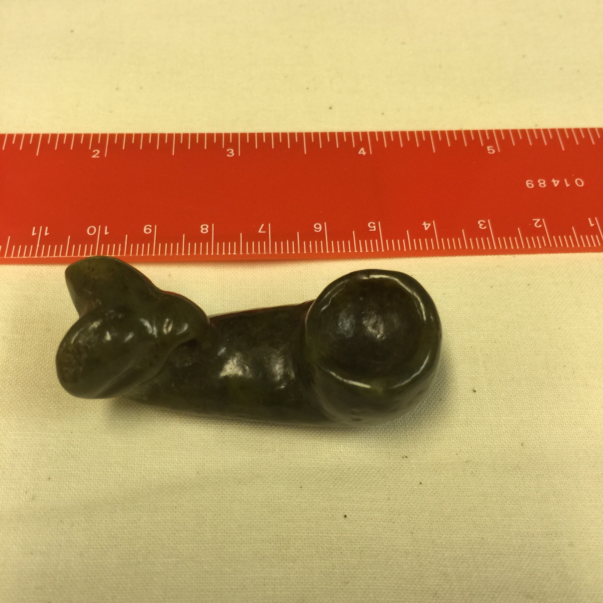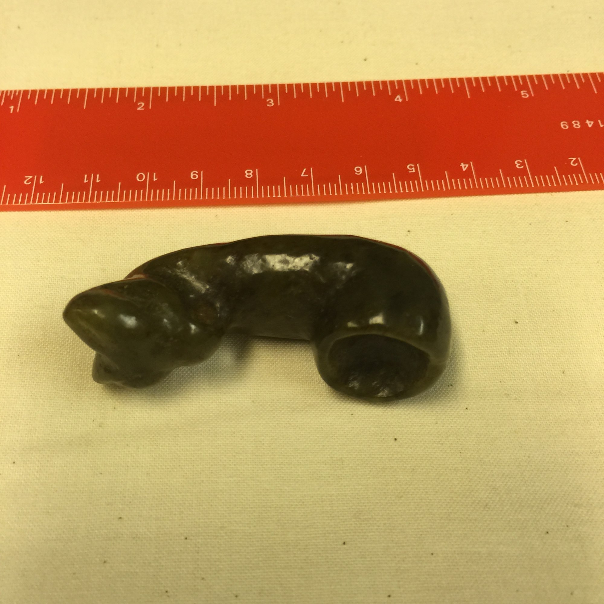 Elephant shaped head; figure appears to be reclining bowl at bottom of figure.