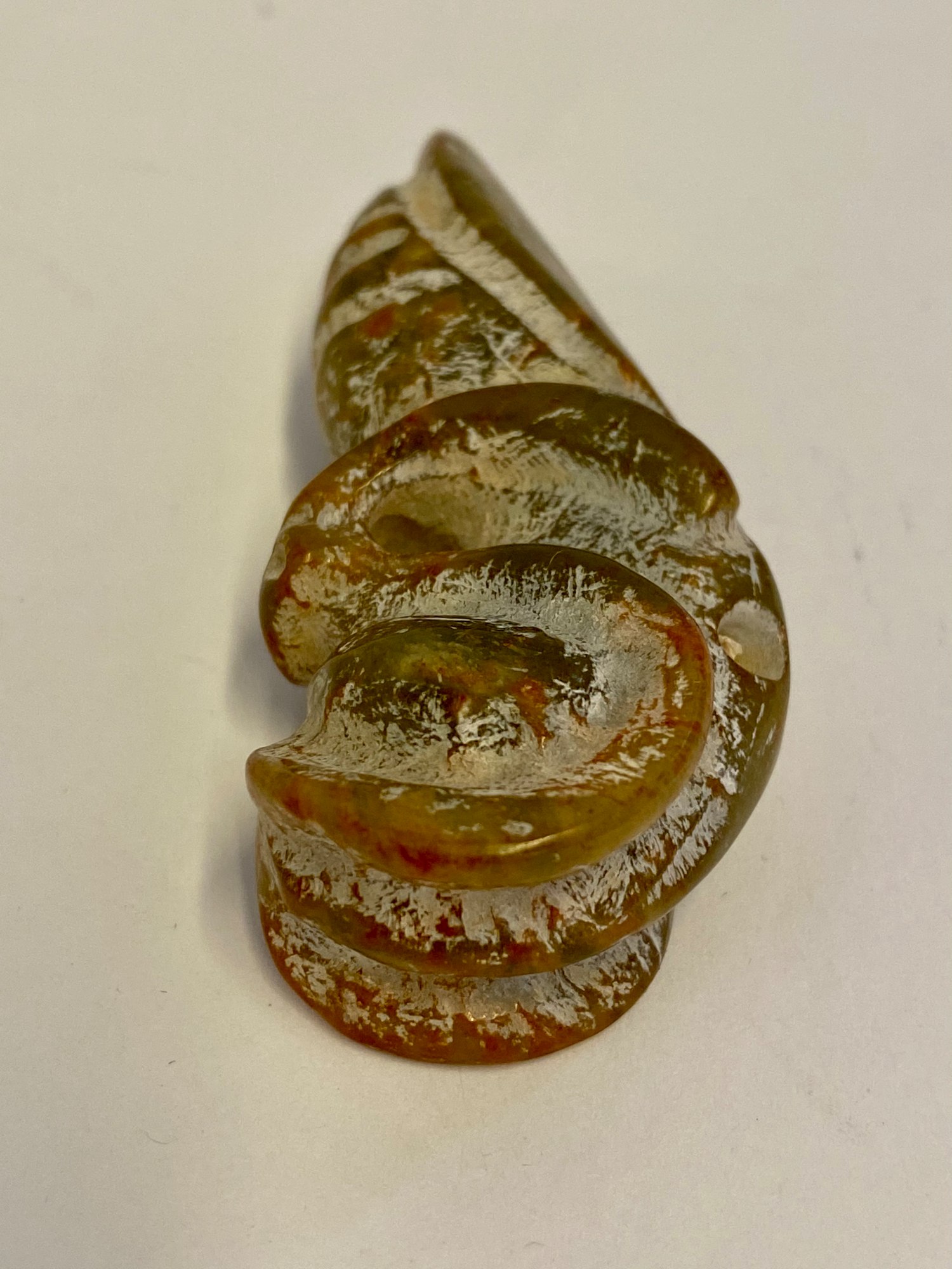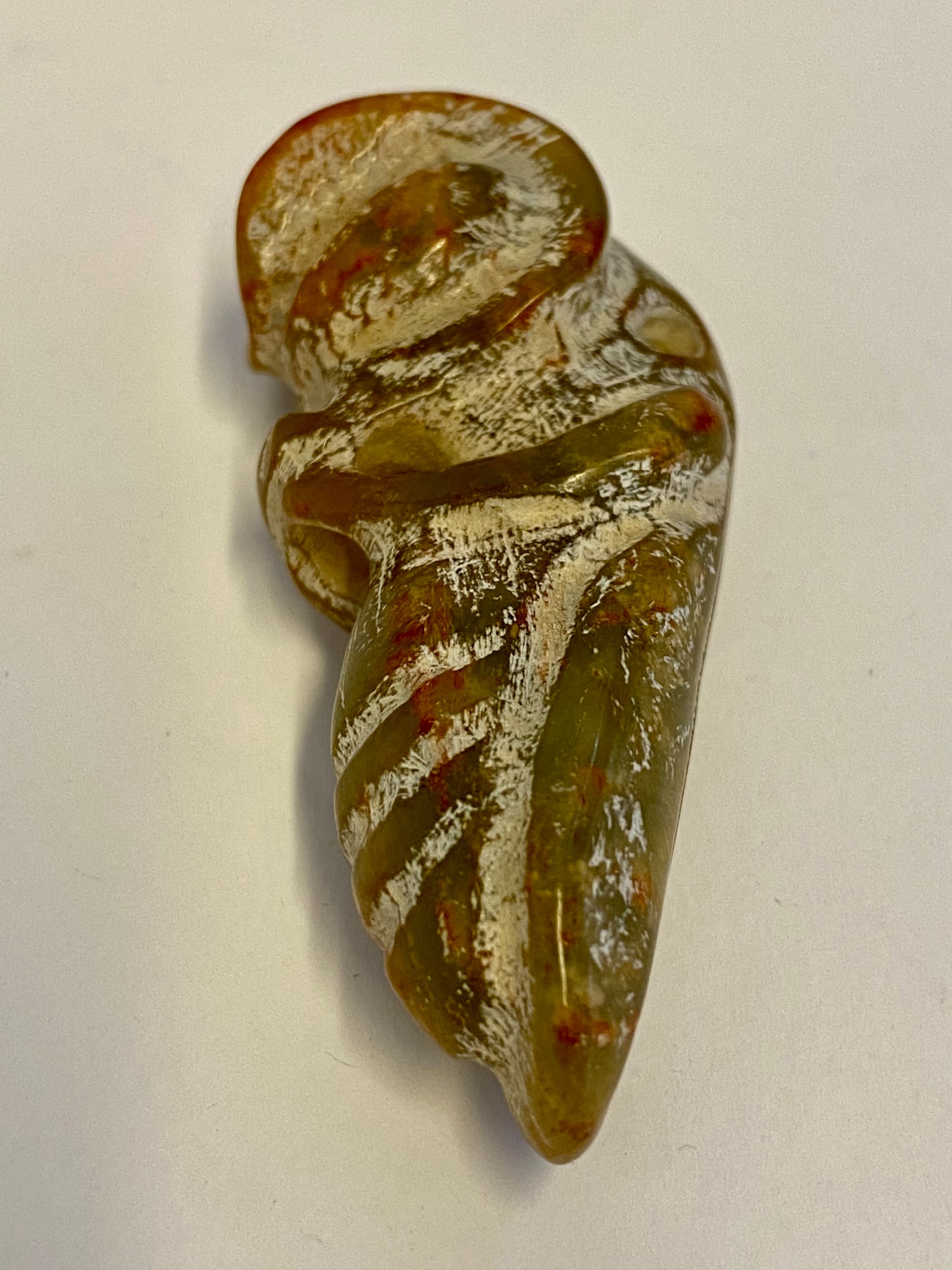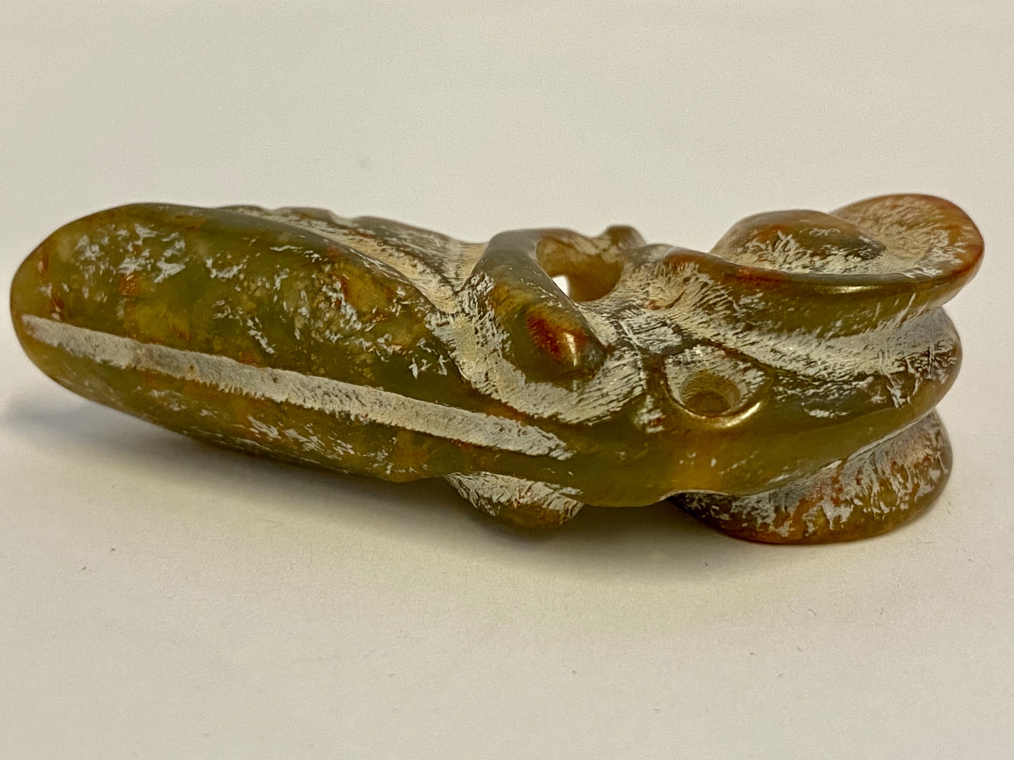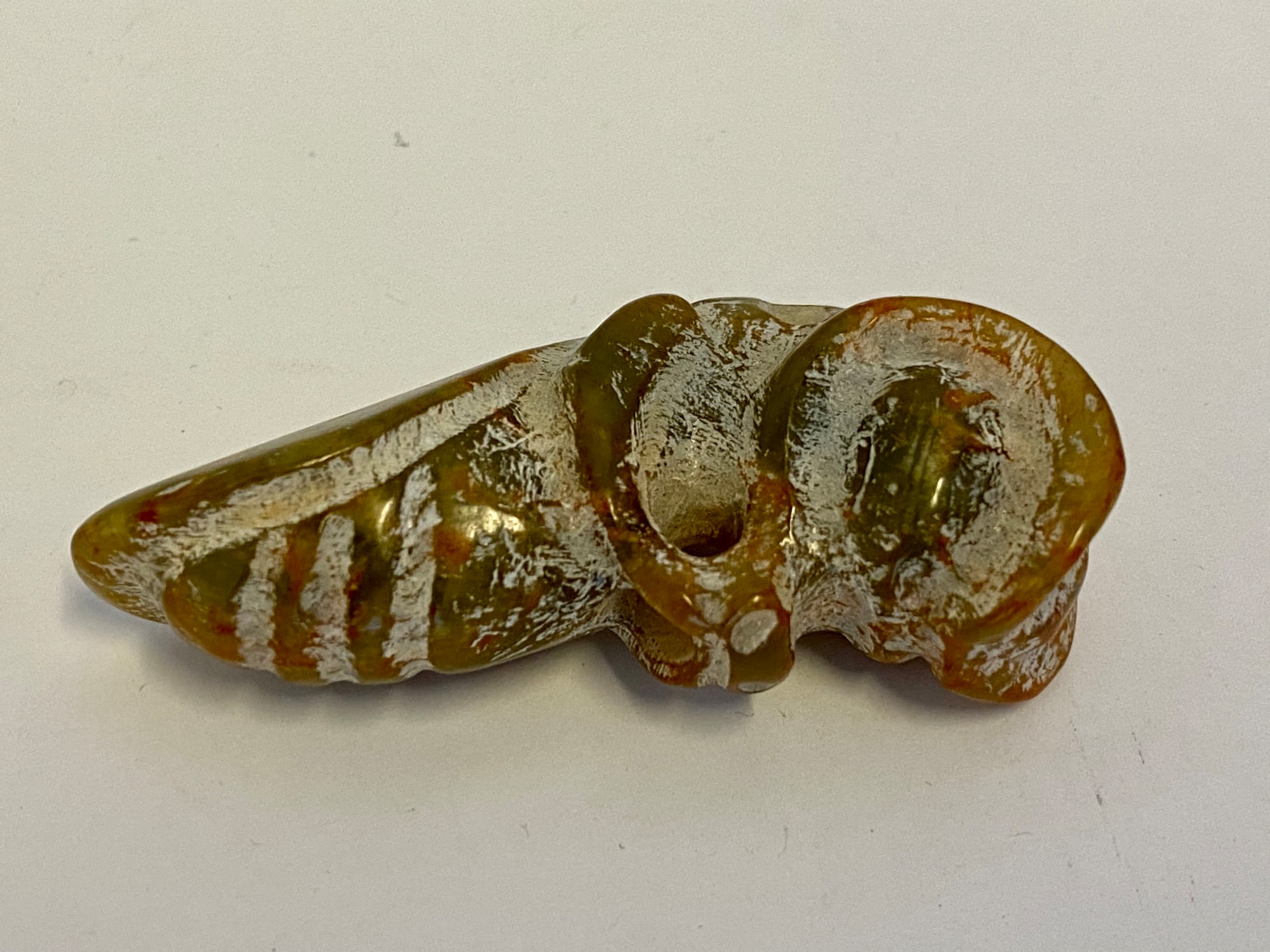 Zoomorphic jade sculpture from the Hongshan culture (4700 – 2900 BCE). Creature appears to be a cicada with large eyes taking up majority of head and wings swept back over the abdomen. Stone is pale green with some pale orange speckle accents.