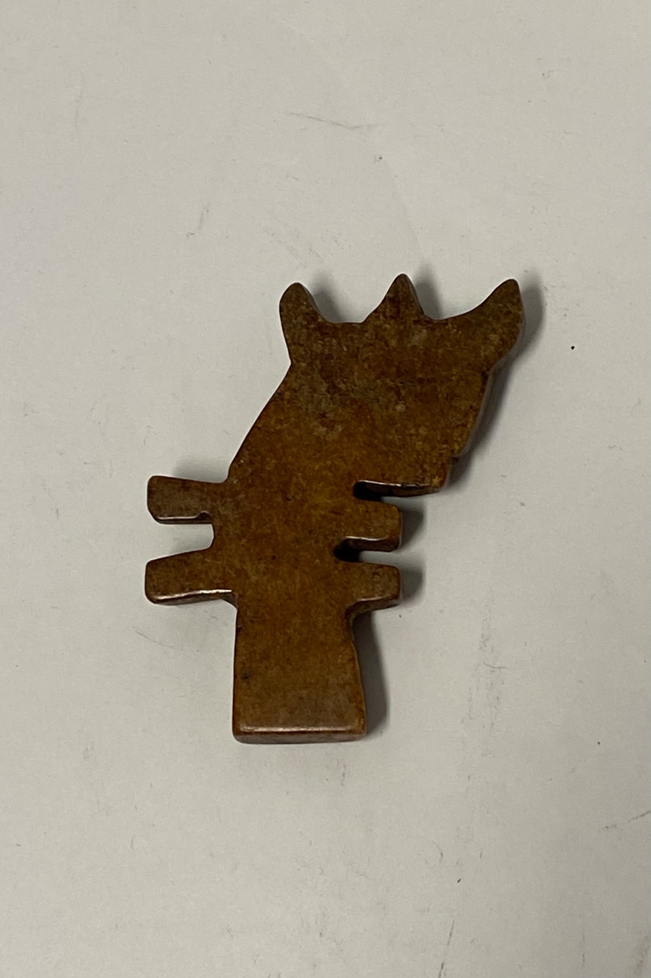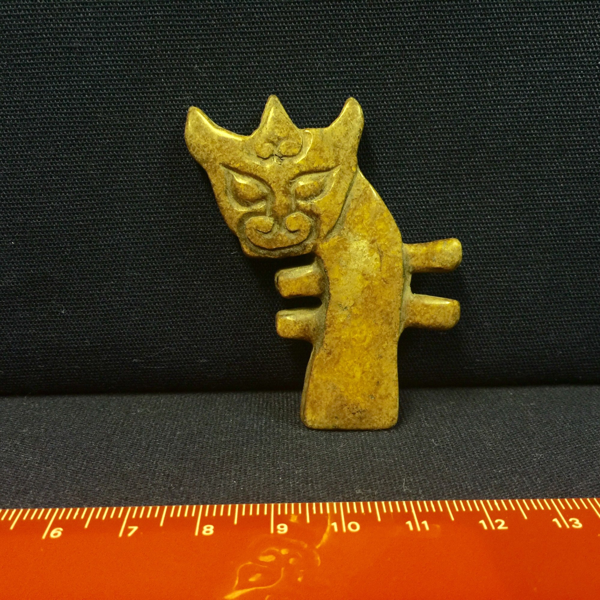 Zoomorphic jade sculpture identified as Hongshan (4700 – 2900 BCE). Figure has head with three horns, two eyes, and snout turned to the left attached to body with four appendages. Reverse side is flat and unadorned.