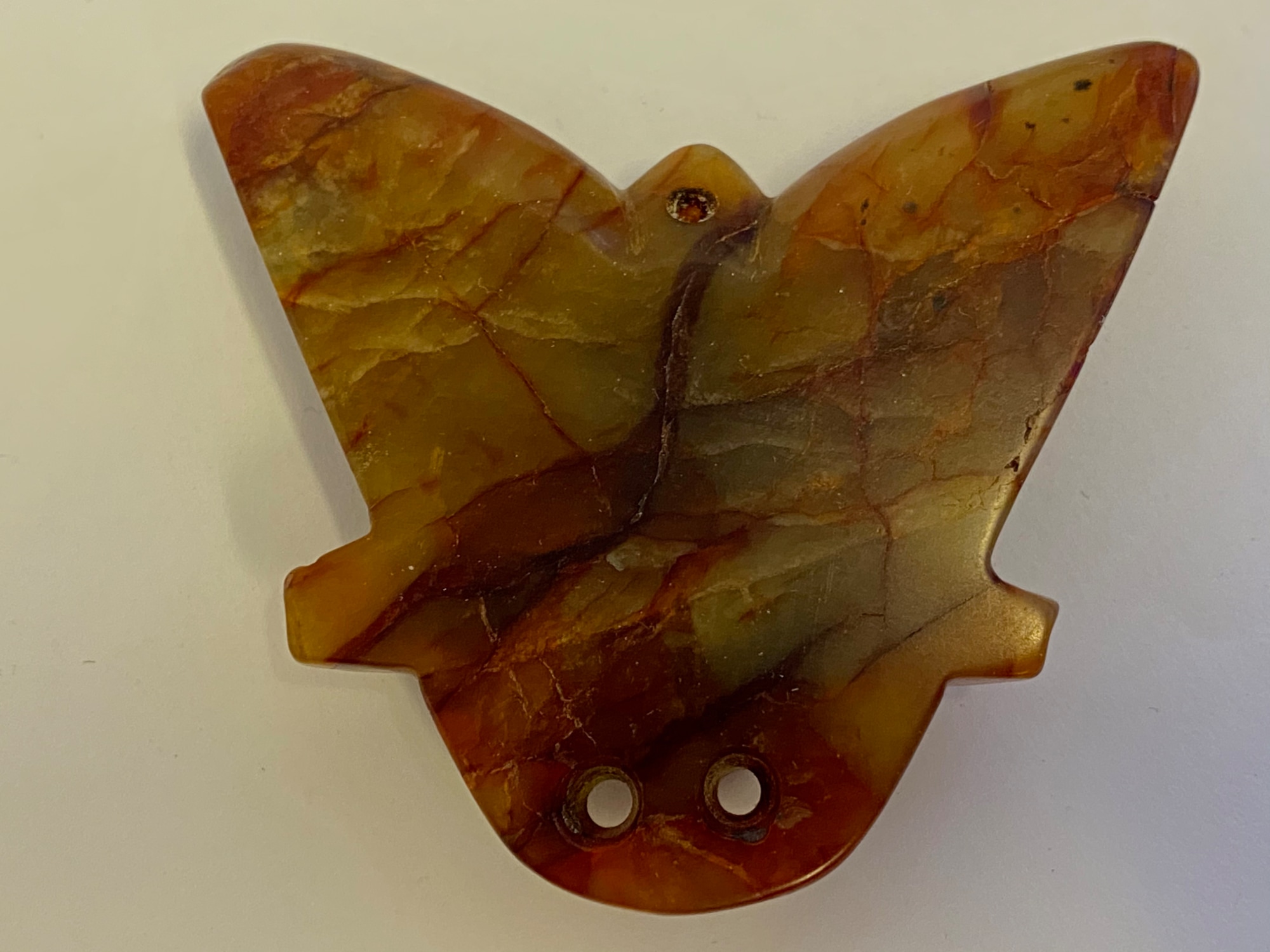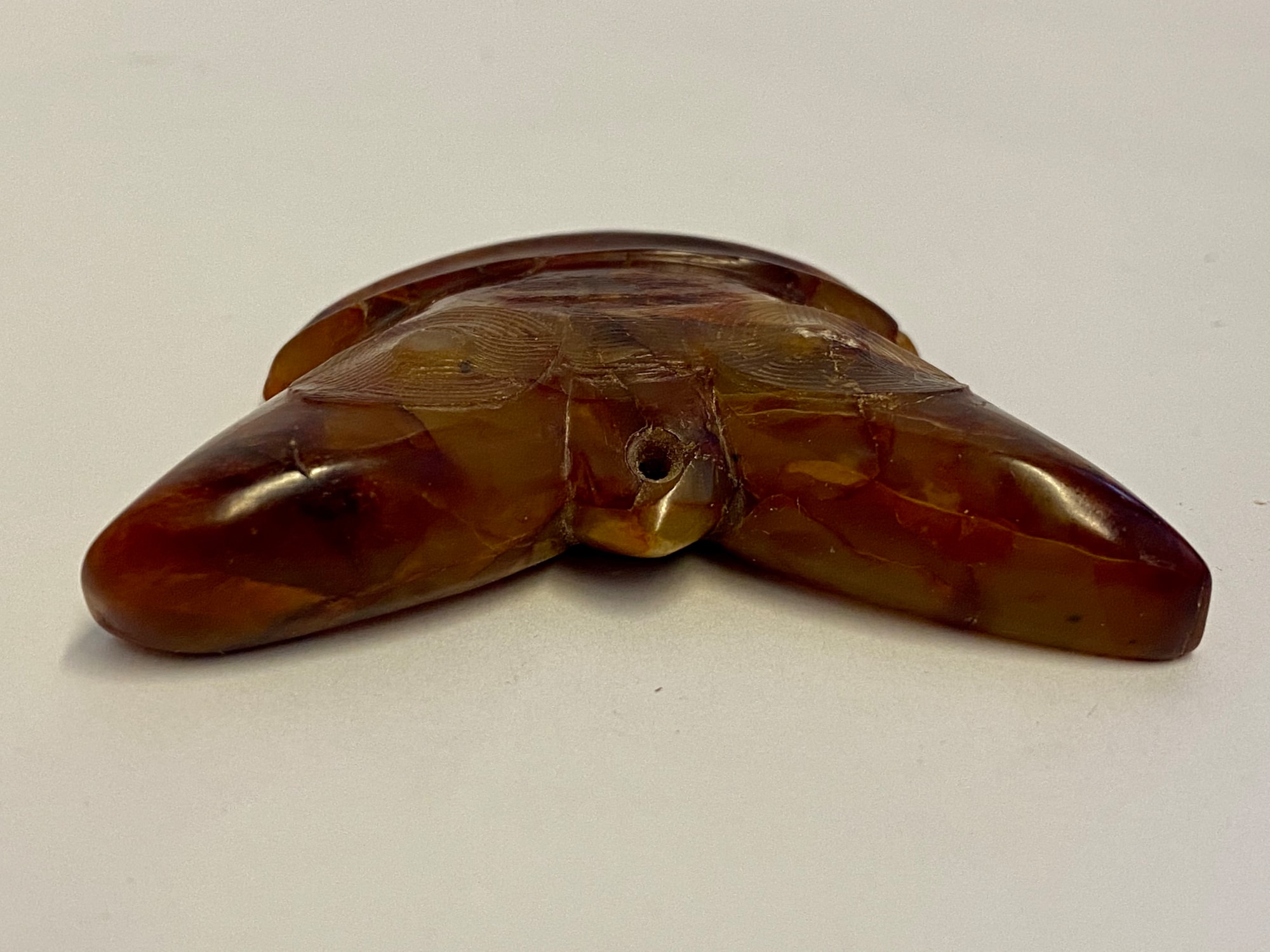 Zoomorphic jade figurine from the Hongshan culture (4700 – 2900 BCE). One side has intricate fine etchings depicting symmetrical facial features. One hole to string object punctures top of head between horns. Two holes puncture bottom of sculpture. Reverse side is flat and unadorned. Stone is burnt orange in color.