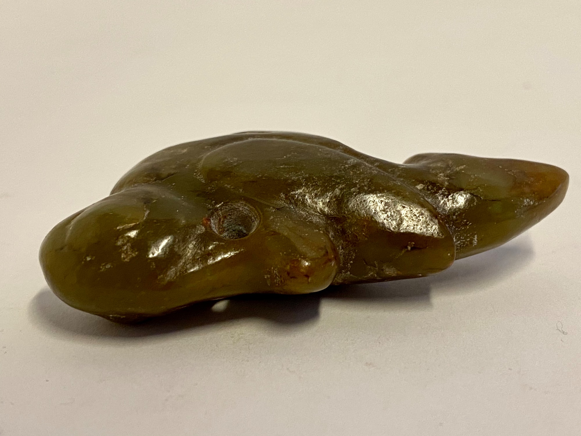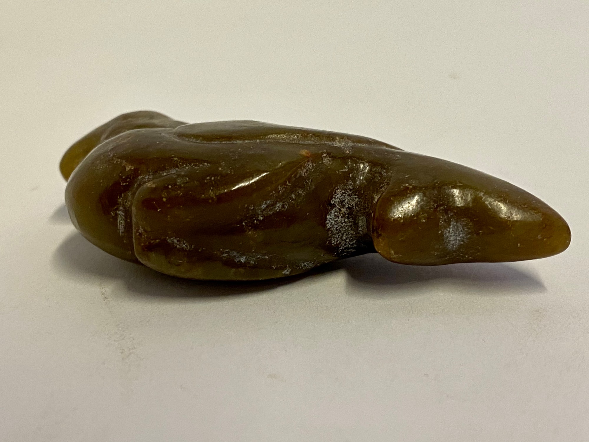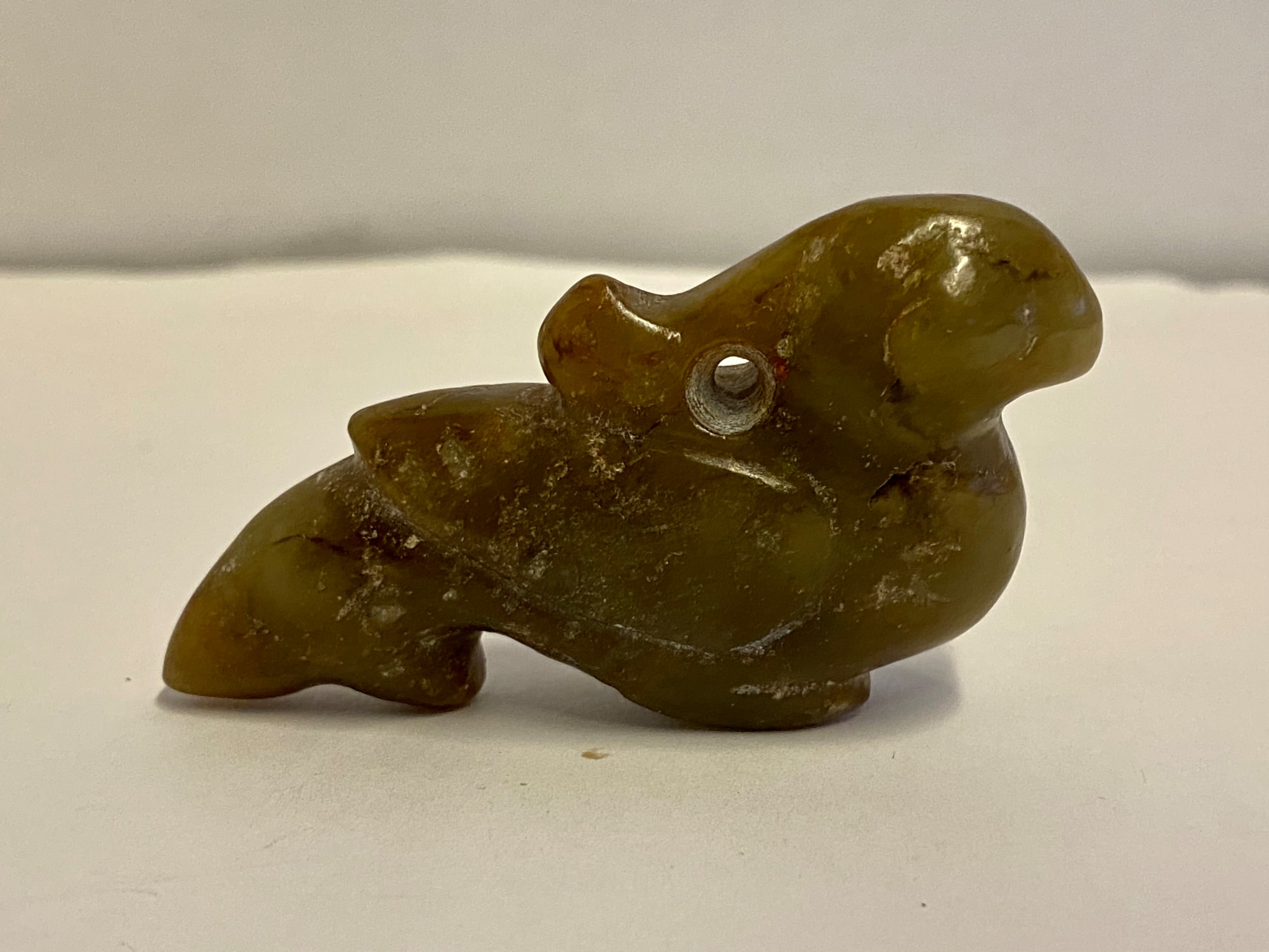 Zoomorphic jade sculpture from the Hongshan culture (4700 – 2900 BCE). Figurine depicts bird with round eyes and short-beaked head, small round belly, and wings swept back towards tail. Hole to string object punctures nape of creature. Stone is olive green.