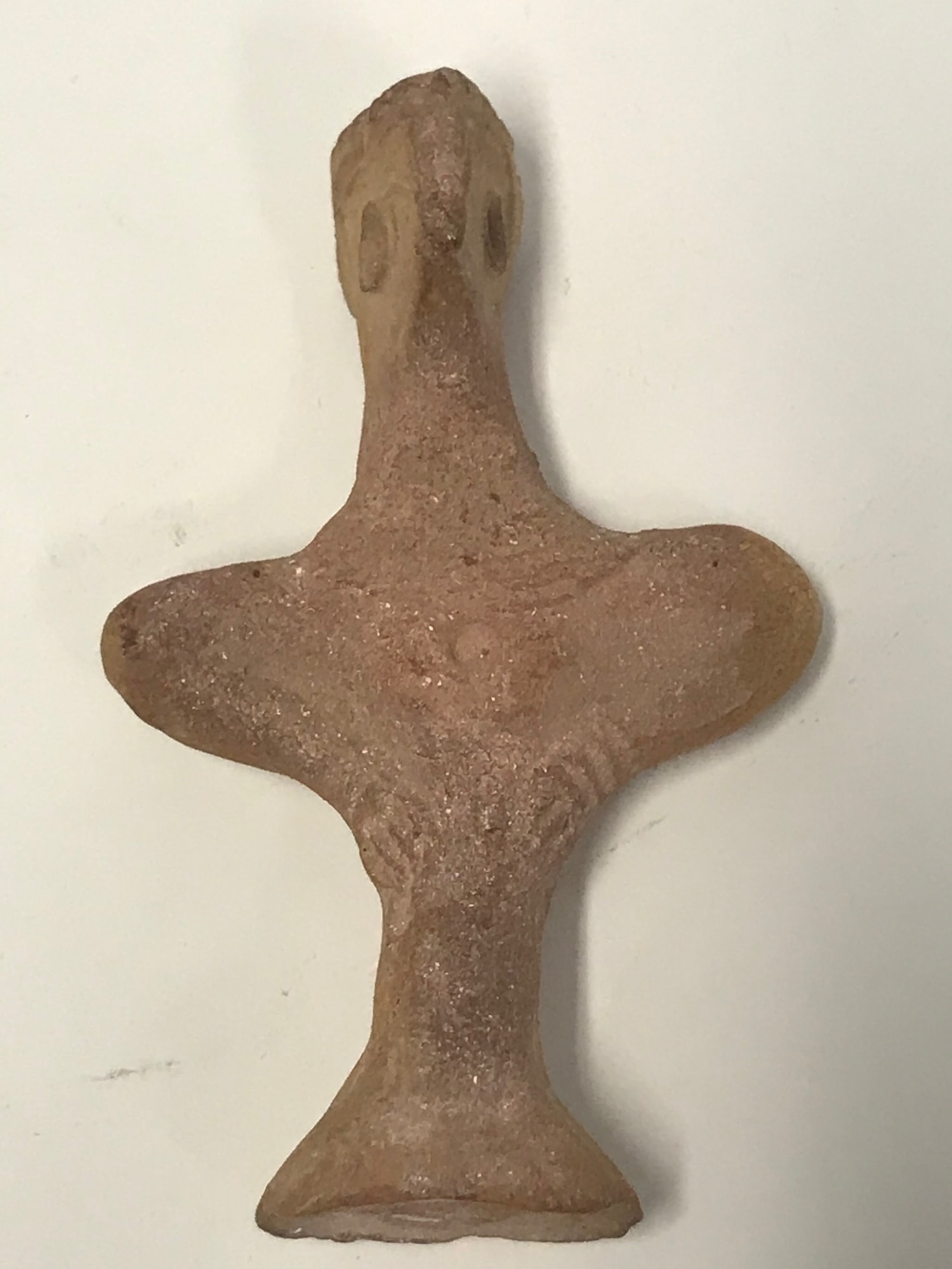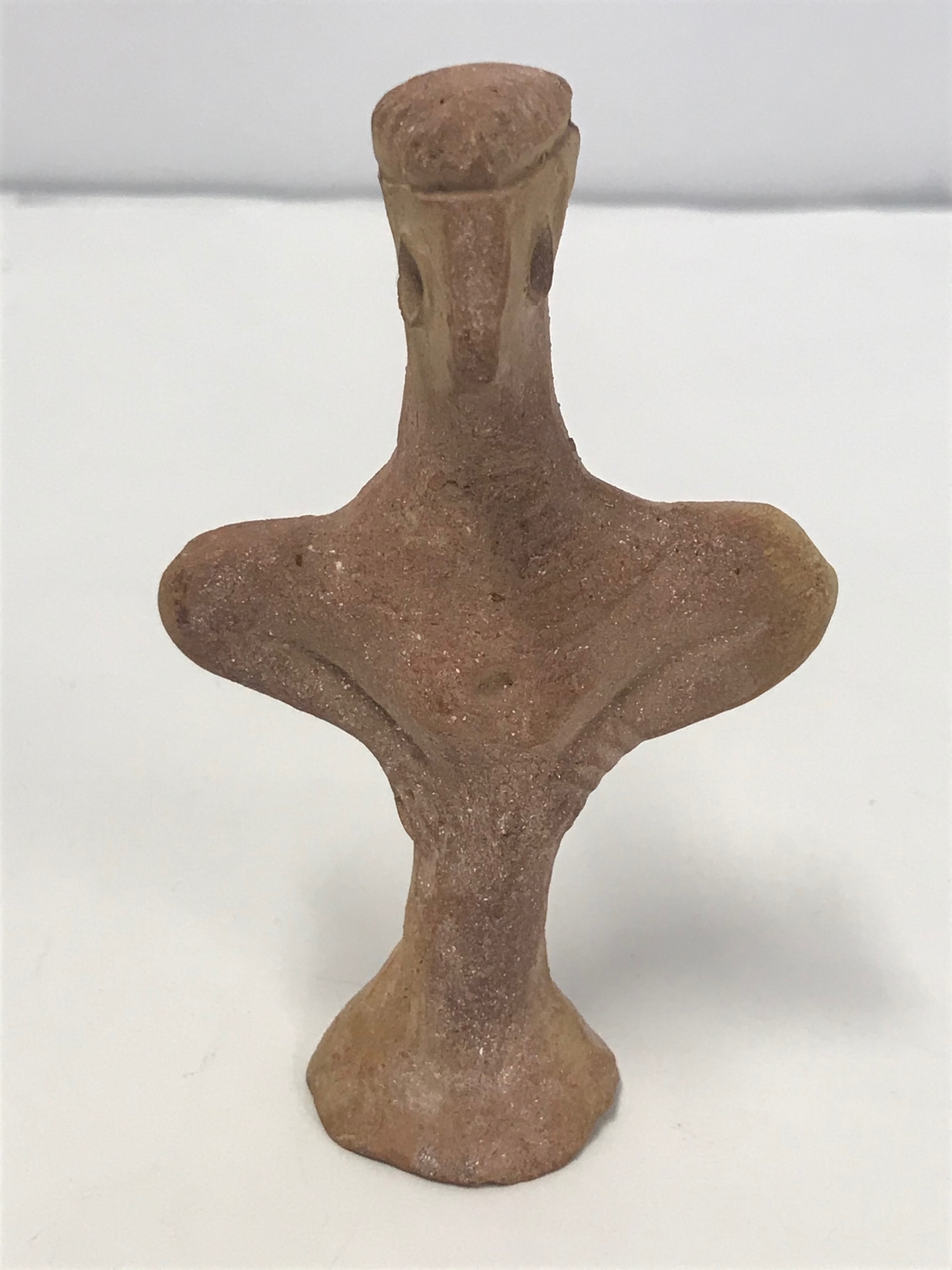 Induus Valley figure of a male with hands on hips, wearing bangled necklaces and bracelets. Figure has short hair and open eyes. The face is bird-shaped with no mouth opening. Figure stands on a flat base in lieu of legs or feet. Male figures are rare in the Indus Valley. The figure is believed to be from the Harappo site.