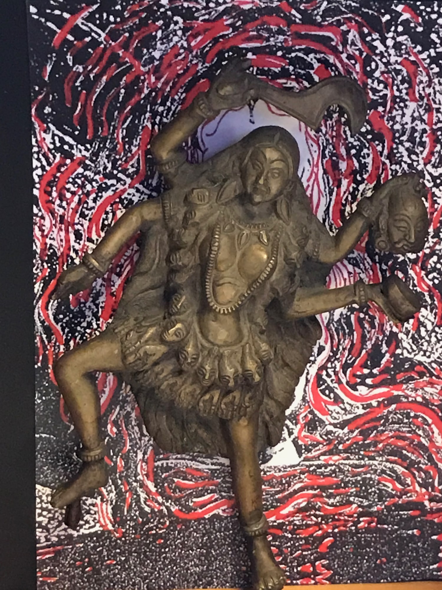 A bronze figure of the Hindu goddess Kali mounted on a print, inside a thick frame.