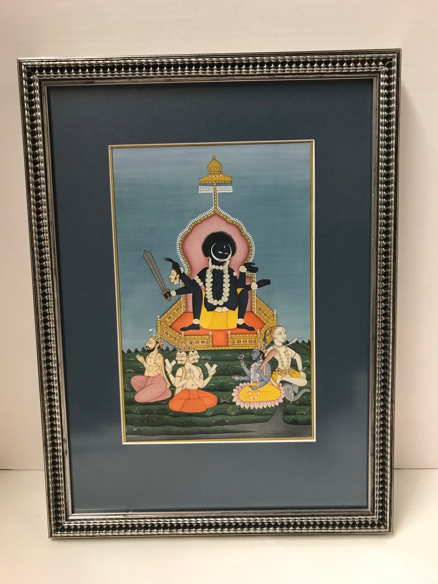 Shown here is the Holy Trinity of classic Hinduism: Brahma, Vishnu, and Shiva. Brahma, the Creator of the universe, looks in all four directions. He is also god of wisdom, while his partner Sarasvati is the goddess of wisdom. learning and music. He is not to be confused with Brahman, the world soul, with which every individual soul (atman) seeks to reunite. Blue Vishnu on a lotus is the Preserver of the universe. His partner, Lakshmi, is beauty. Shiva with a snake is the Destroyer of the universe. Shiva's partner, Uma, is perishable matter. The activities of the Holy Trinity are all happening all the time. The main point of this image is that Kali (in the birth giving position with her necklace of skulls) is the Mother of them all. Such a theology is a continuation of the Stone Age and Bronze Age traditions of the Great Goddess, "Giver and Taker of All," before the male principle became dominant in India with the arrival of the Indo-Europeans. The fourth god pictured is Indra, "King of the Gods" in ancient Vedic mythology with eyes on his body. He appears to have come to India with the Indo-Europeans. This modern replica was commissioned from the esteemed artist Shri kailish Raj who continues the rich tradition of his ancestors. (FLG)