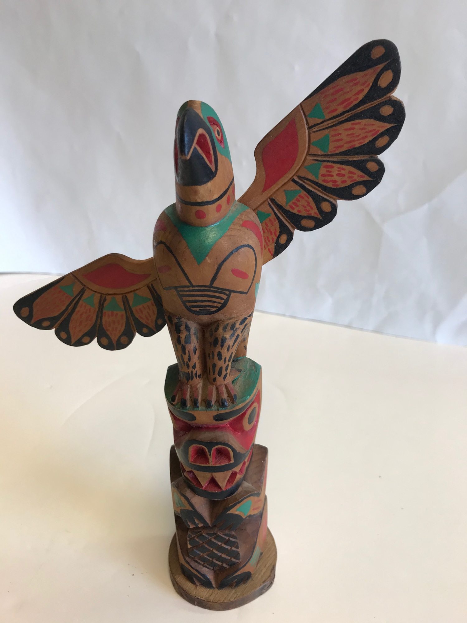 A small version of a Kwakiutl Totem Pole, from the Pacific Northeast, Vancouver Island.