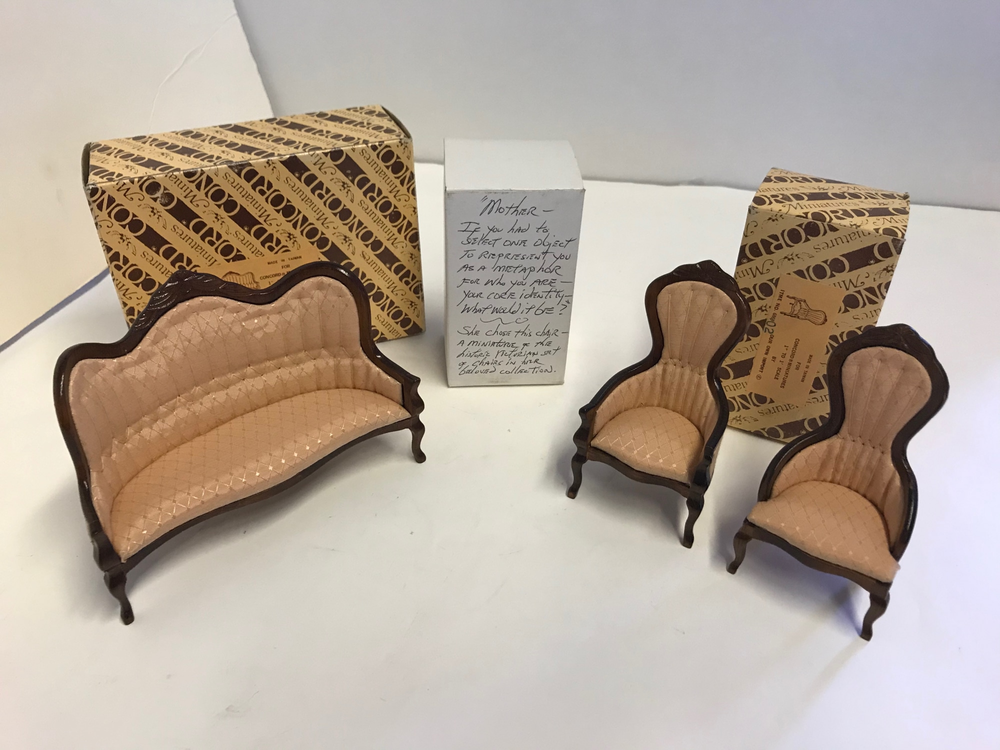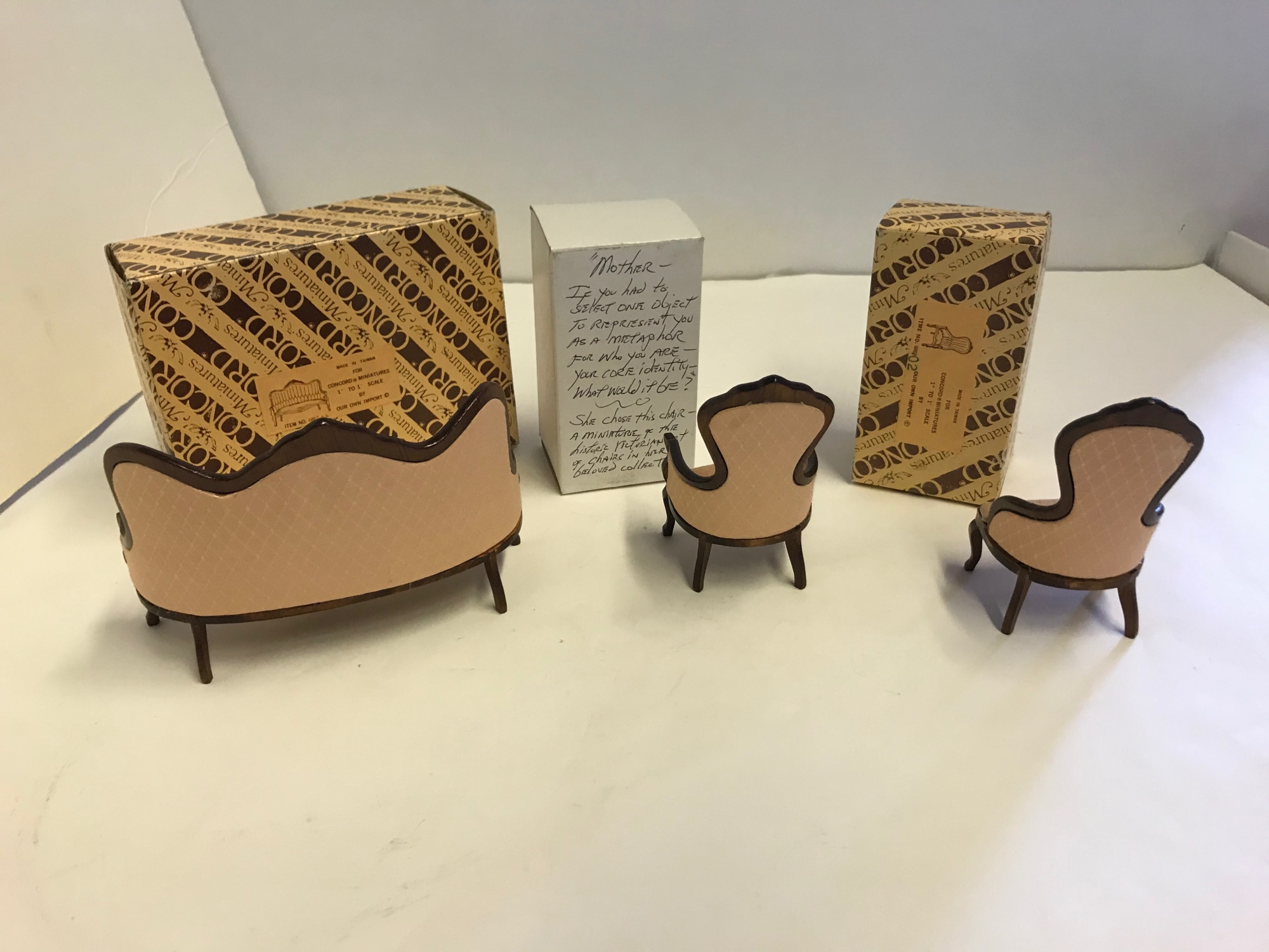 Item c: sofa 1.7 oz., 4.5" H x 6" W x 2" D, made in Taiwan in box labeled CONCORD MINIATURES