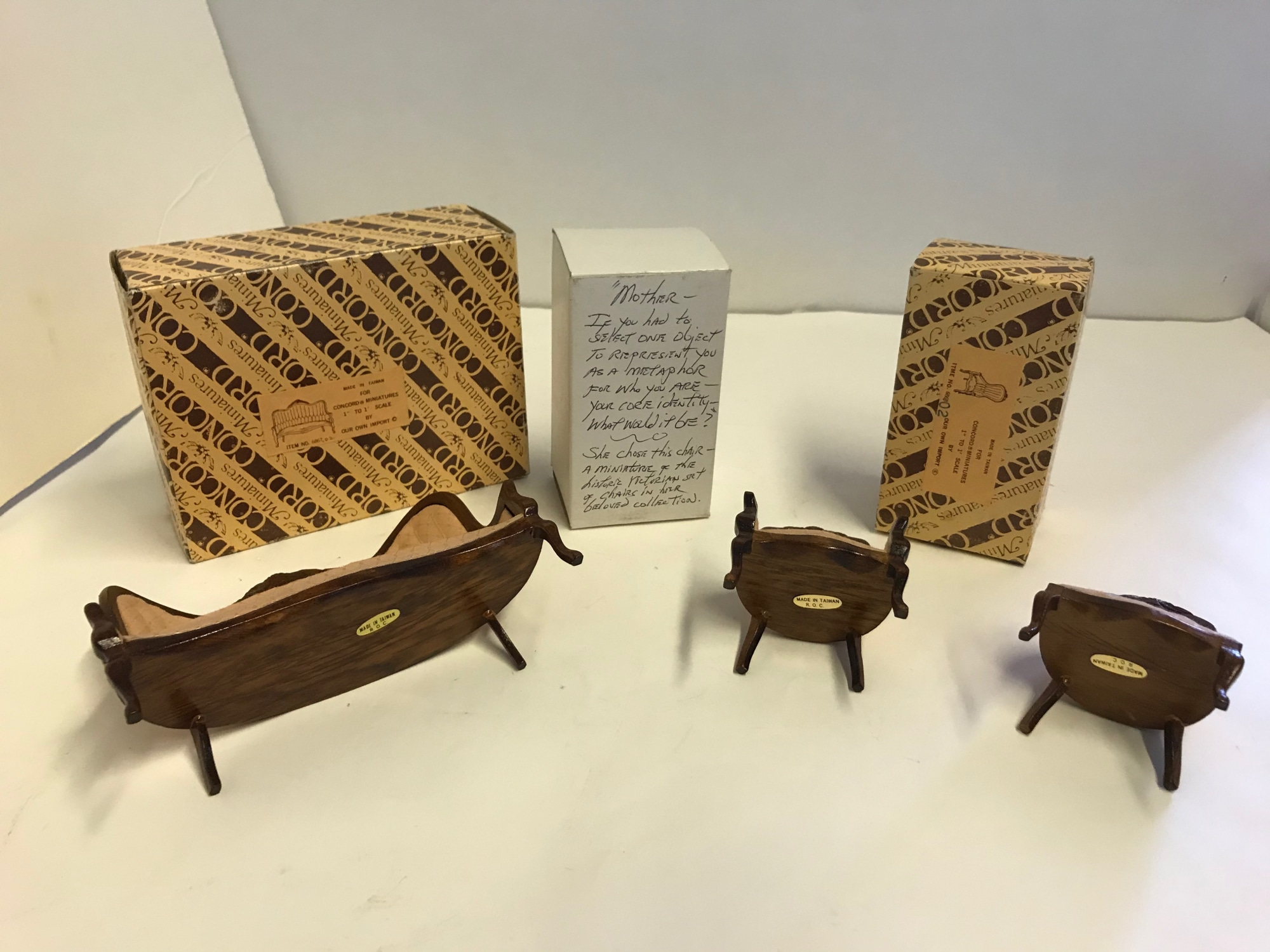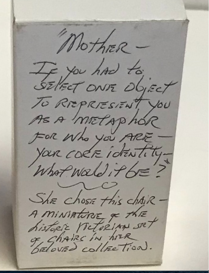 Item a: box labeled with note "Martha Lanier--she chose miniature of the beloved Victorian set of chairs in her collection," containing a chair, .8 oz., 4.25" H x 2 5/8" W x 2" D