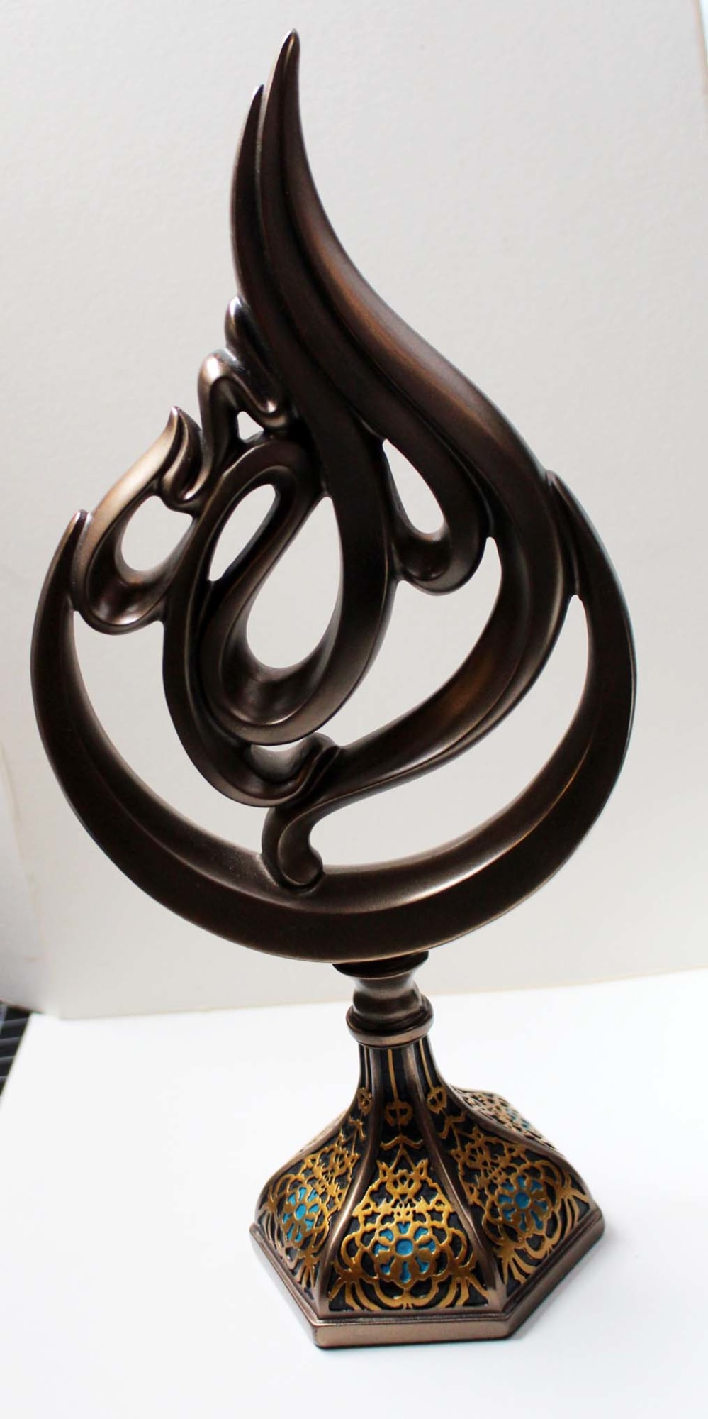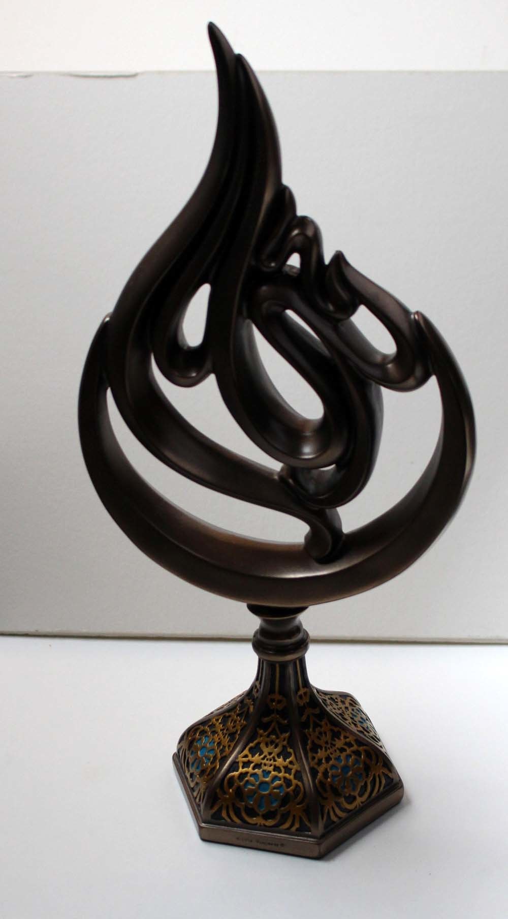This object is a sculpture of the Arabic name of God, “Allāh.” It is of the type of finial sculpture known in Arabic as ʿ"alam" and in Turkish as "alem." Created from metal alloys like brass, or ceramic, or wood, this style replicates the sort of ornamental decorations to be found on tops of flagpoles, minarets, mosque domes, and mosque pulpits.