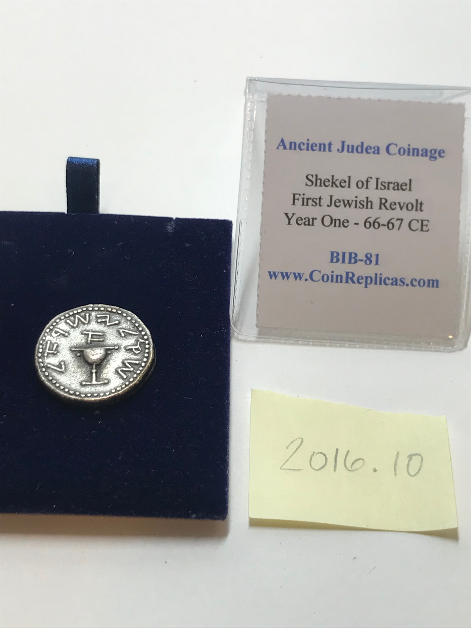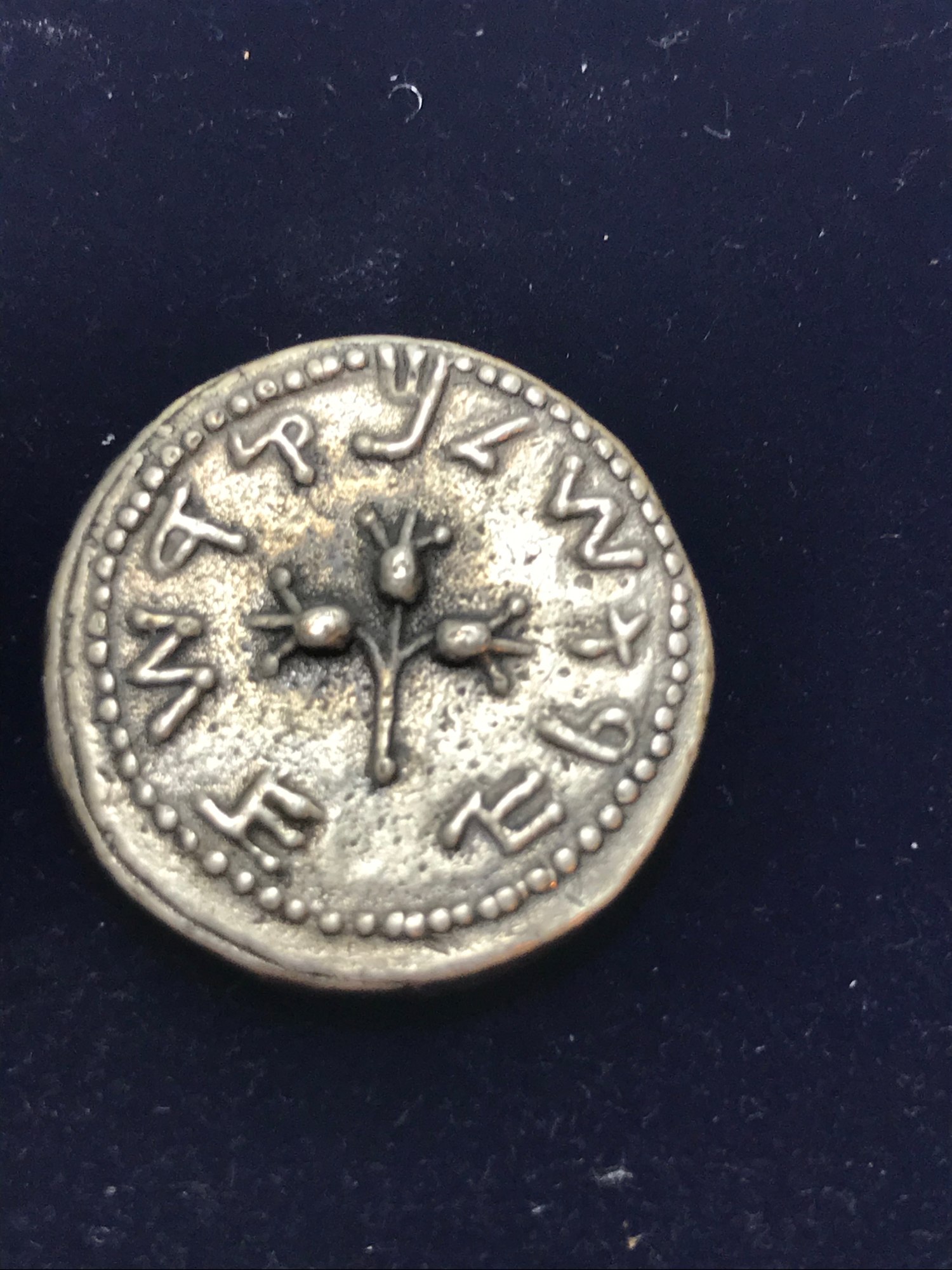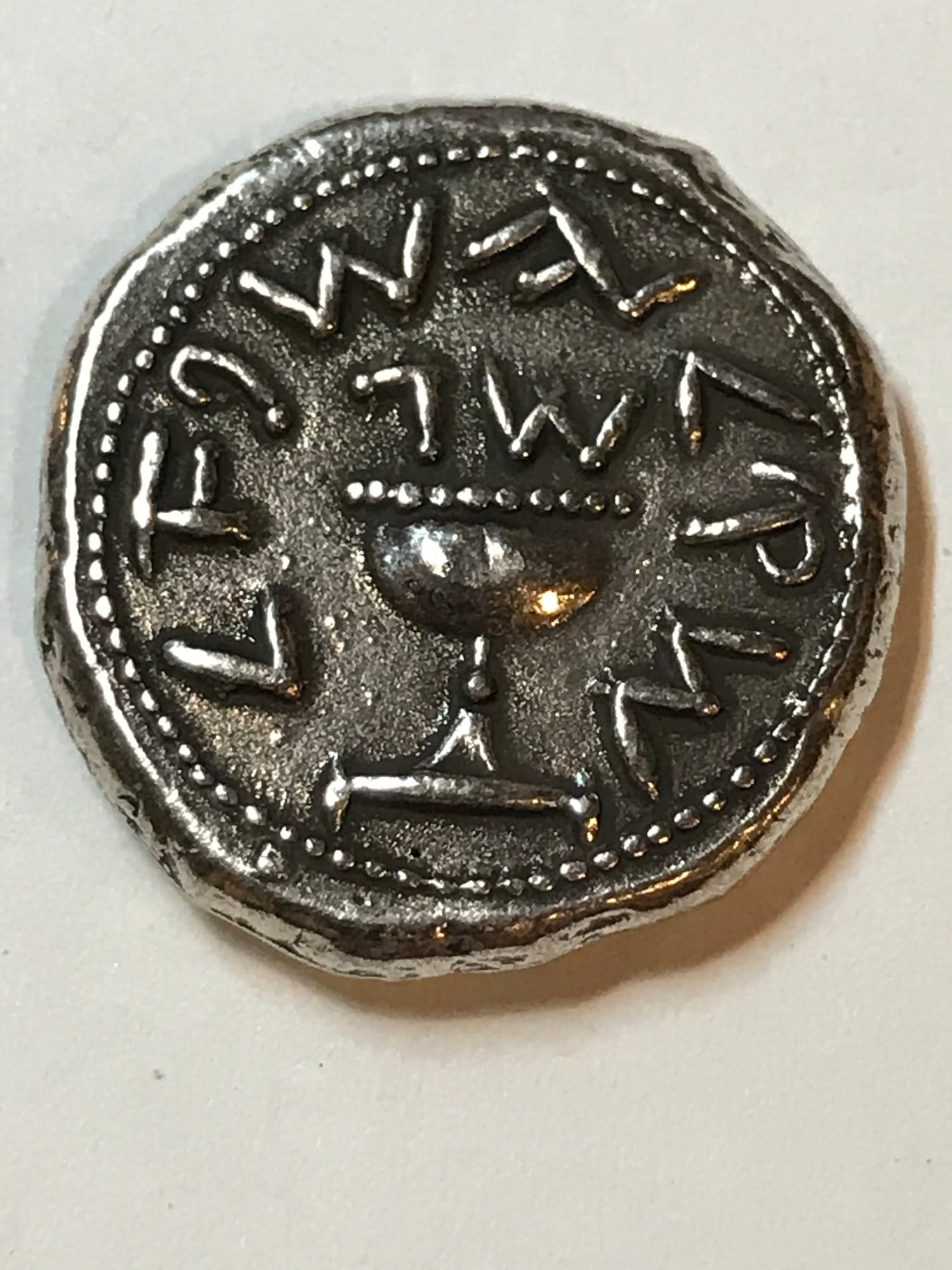 Silver-tone/plated shekel Tetradrachm reproduction is based on coins from Judea in 66-70 CE. On the obverse side is the Omer cup, year two Hebrew; on the reverse are three pomegranates, with Hebrew script.