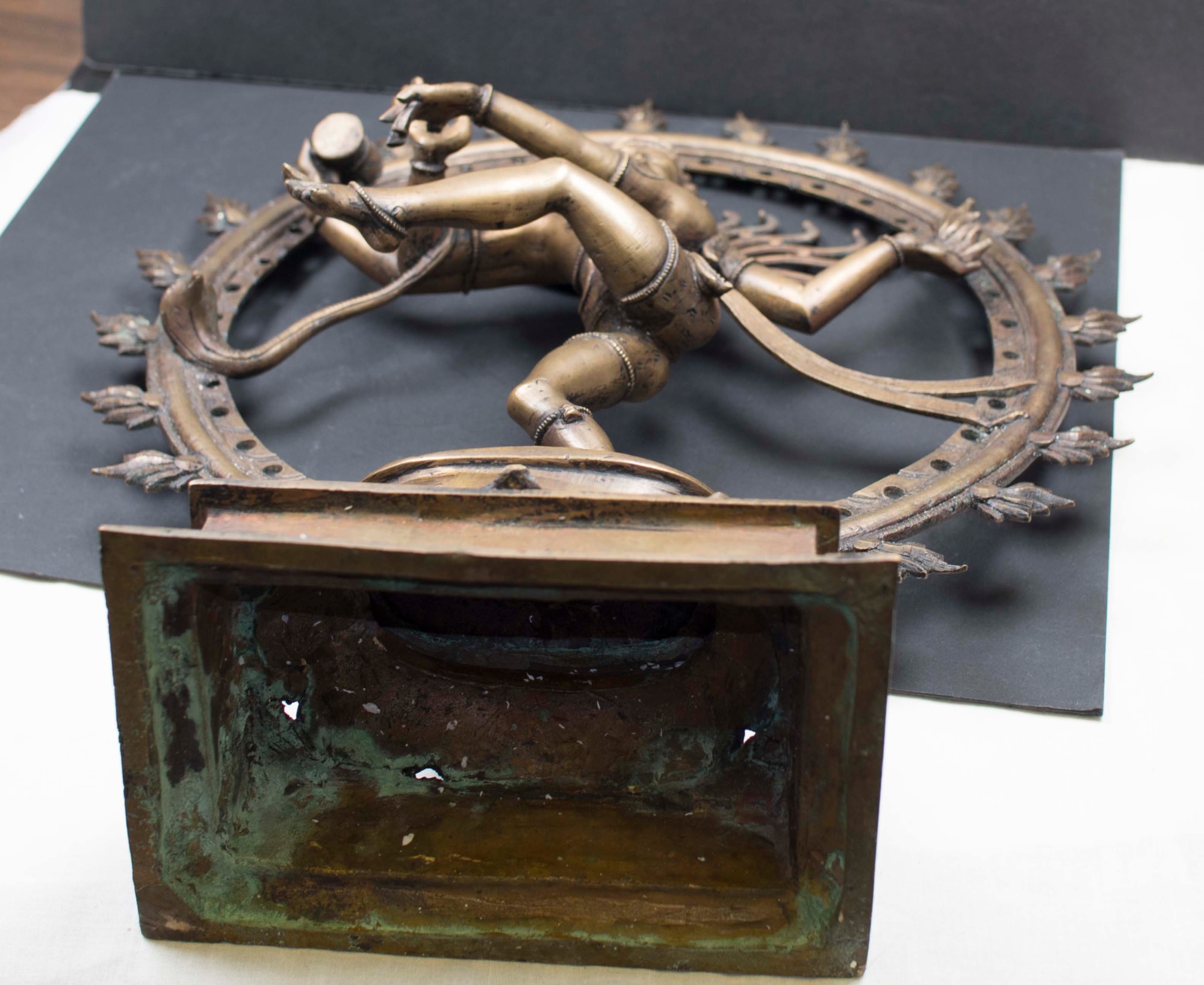 This iconic image of Shiva may well be the best-known image in all of Indian art. It is called Shiva Nataraja Lord of the Dance. Variations of this basic composition were first made during the Chola Dynasty in southern India during the 11th and 12th centuries. Shiva dances with dynamic grace standing on a personification of egotistical ignorance. Around him is the universe as a whole a flaming circle that represents the glowing globe of the material world. In his right hand is a rattle drum. Its sound activates each moment of time. In his left hand is the flame that burns up each moment at the end of its time. The core concept is that Shiva is doing an endless dance of creation and destruction and re-creation again and again and again. This particular bronze was cast in the 19th or early 20th century but was very well done and has a good deal of the character of the earlier bronzes. This sculpture was done in the 12th century Chola style. (FLG)