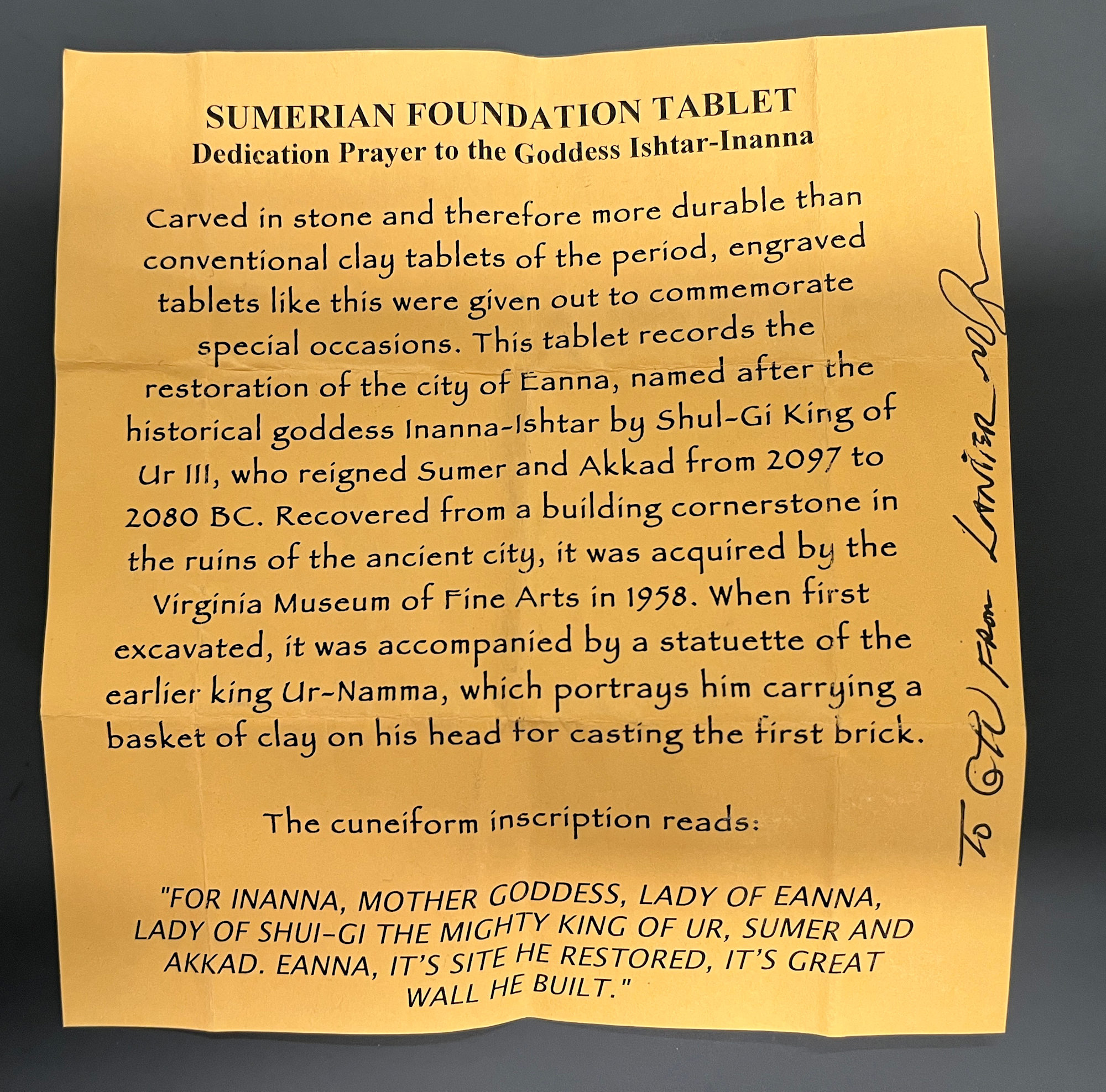Sumerian foundation tablet, dedication prayer to the Goddess Ishtar-Inanna. It records the restoration of the city of Eanna. The original was discovered in 1958 by the Virginia Museum of Fine Arts.
