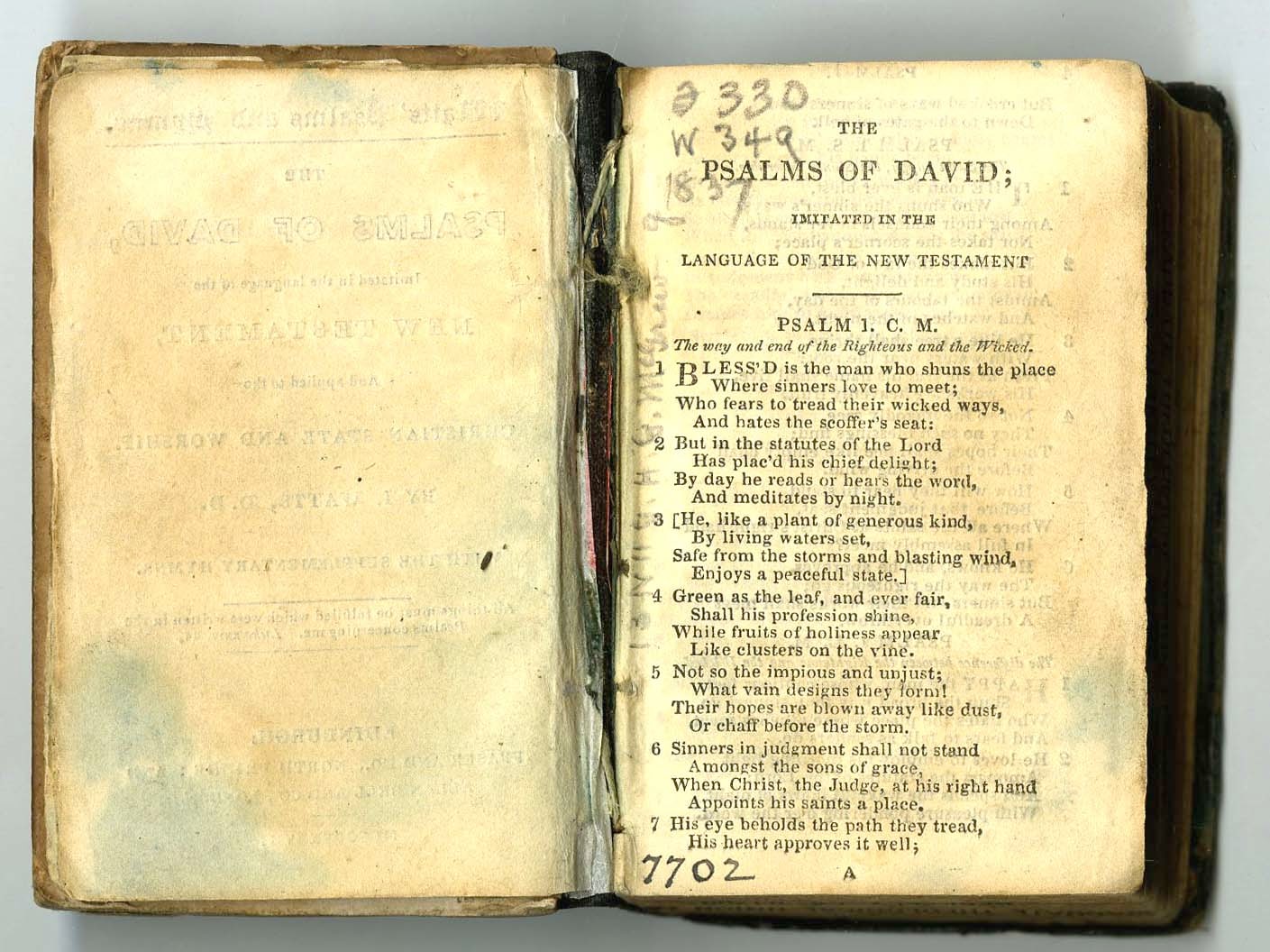Watts, Isaac, 1674-1748, The Psalms of David : imitated in the language of the New Testament, and applied to the Christian state and worship with the supplementary hymns. Edinburgh: Fraser, 1807.