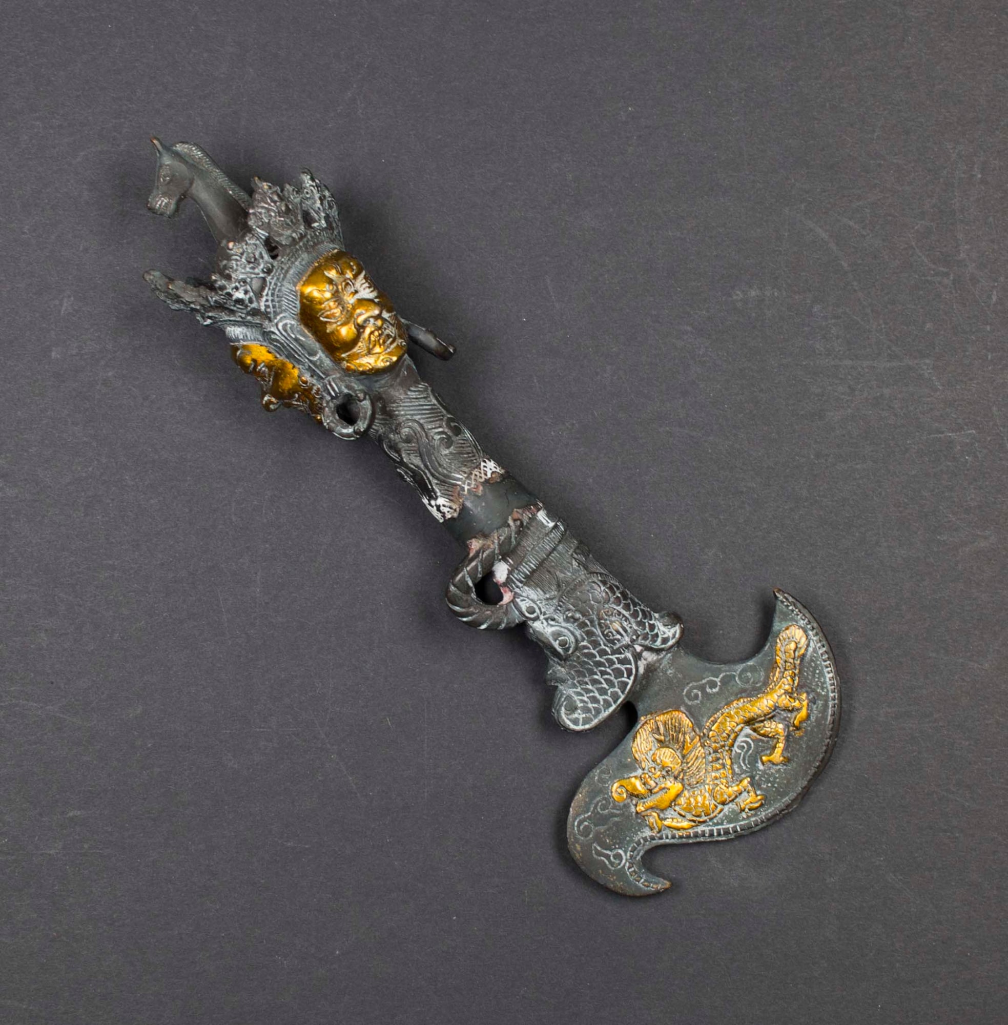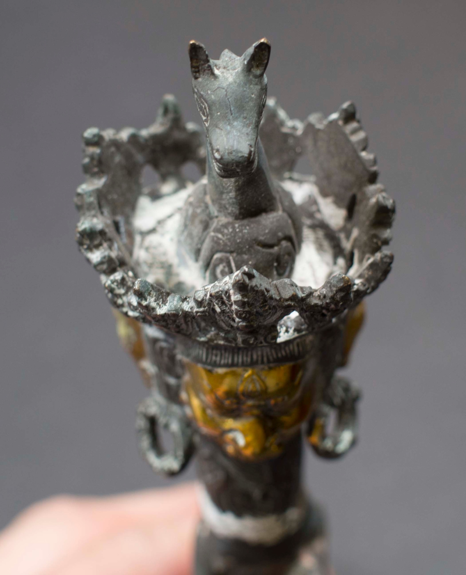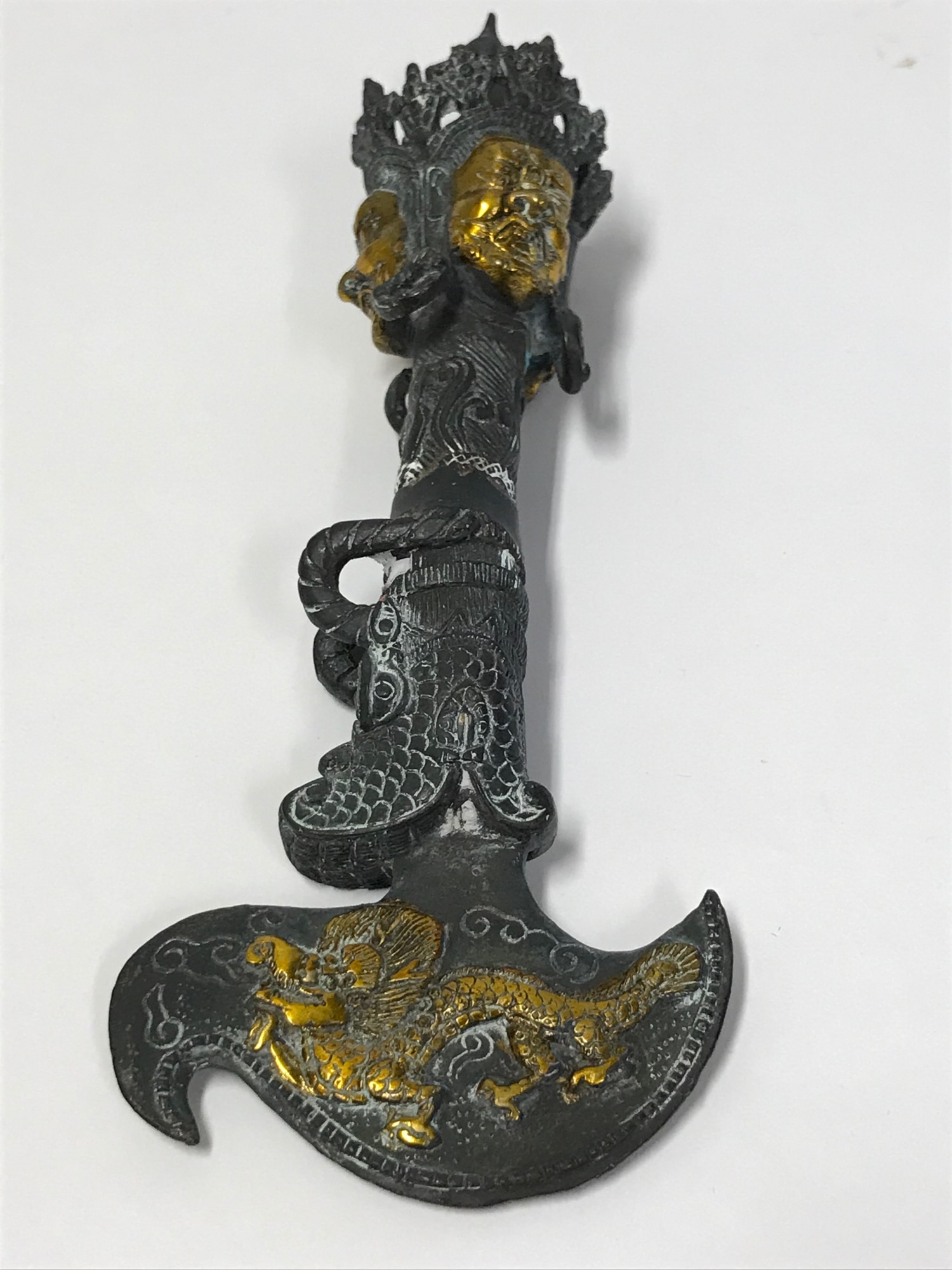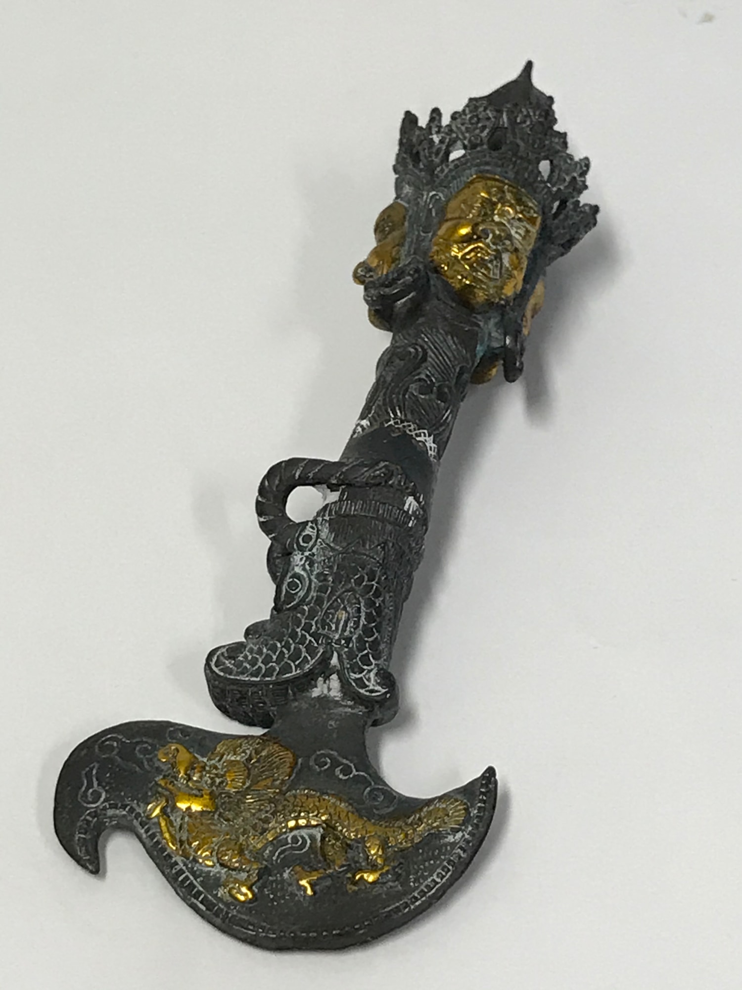 From the original description, "Hayagriva Kartika (gilt): The Kartika is a ritual weapon with a crescent-shaped blade and a handle at the center of its curve. It is designed for use in esoteric rites, and is meant to chop through ignorance. These often have significant ornamentation on their handle and blade, and are typically made of metal."