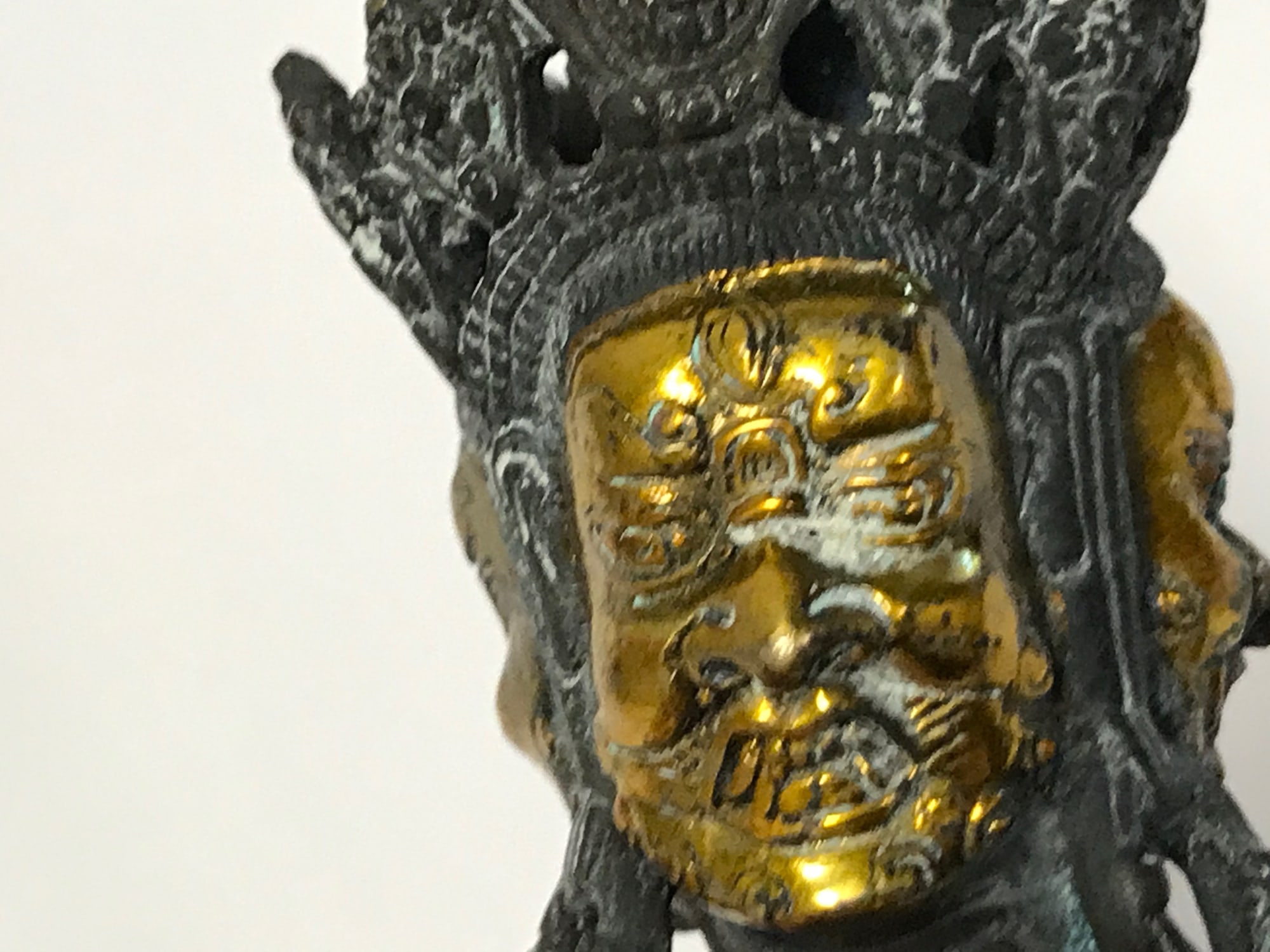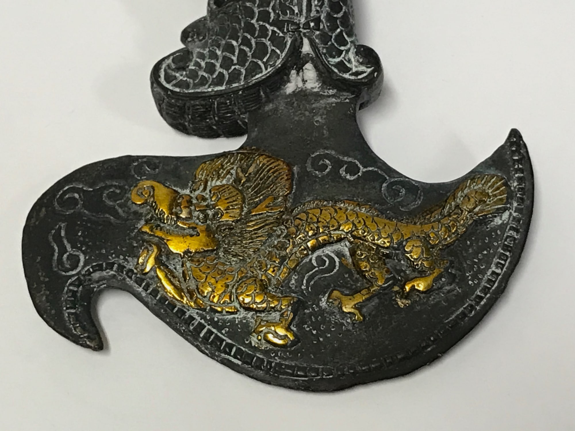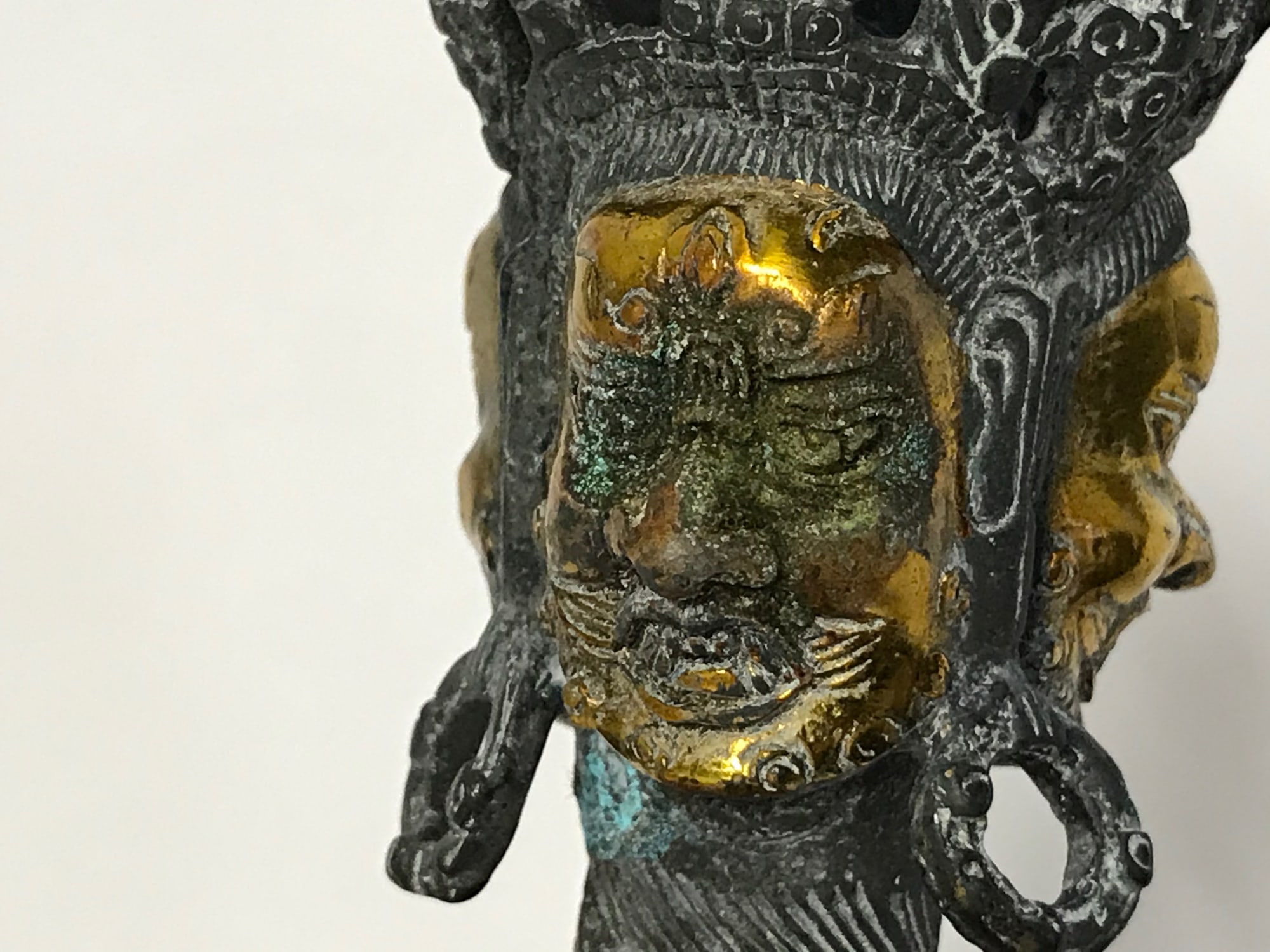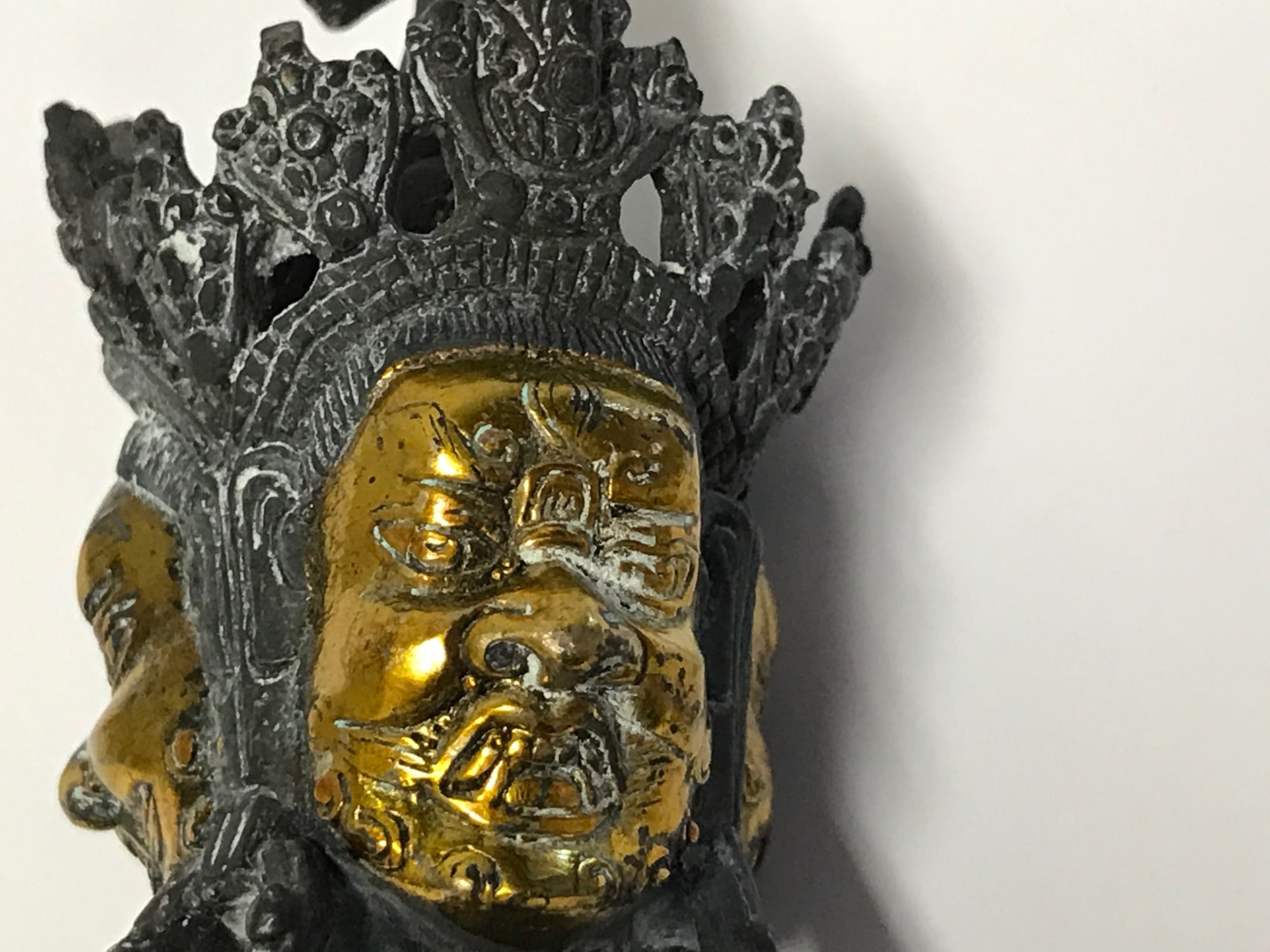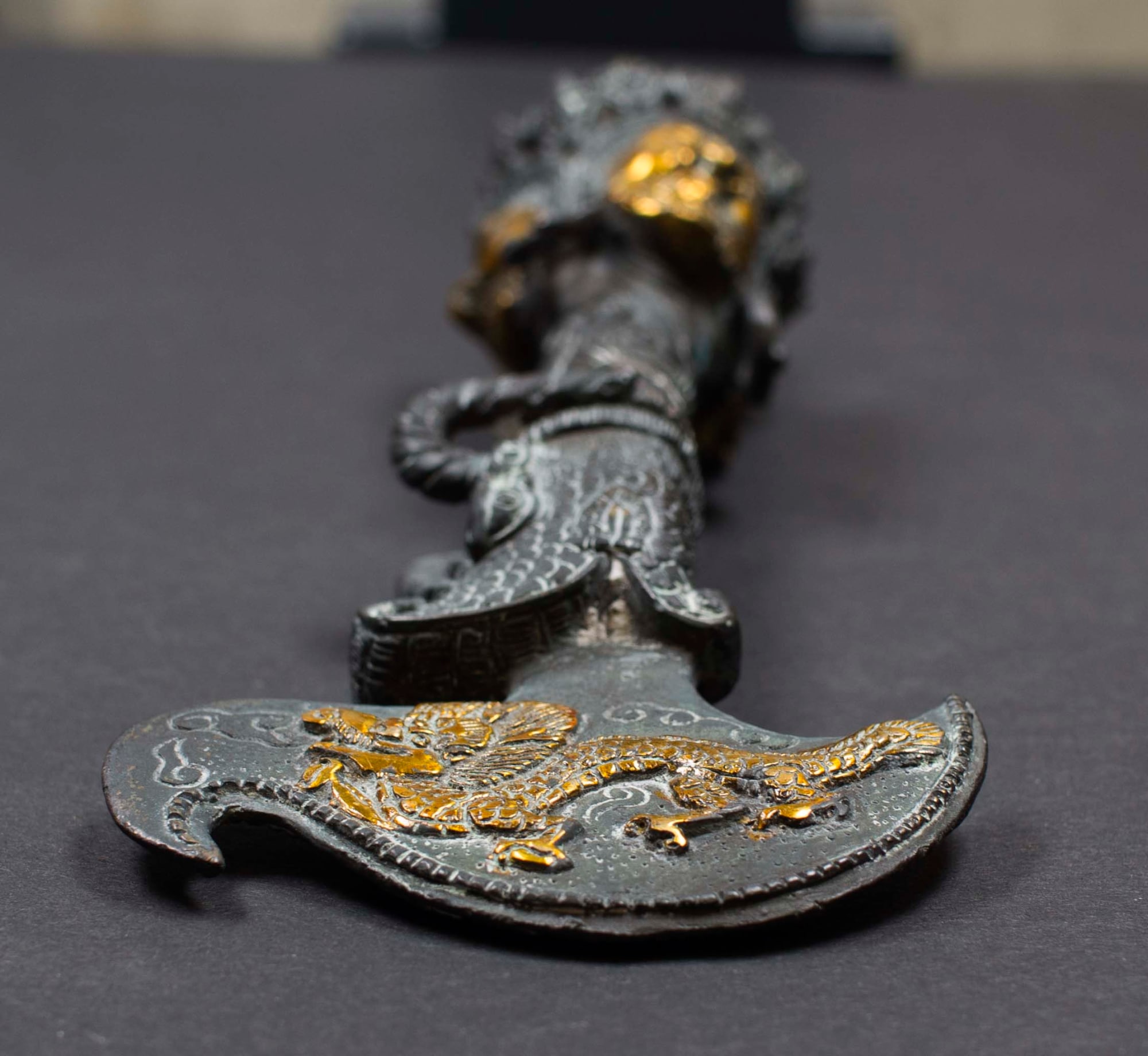 From the original description, "Hayagriva Kartika (gilt): The Kartika is a ritual weapon with a crescent-shaped blade and a handle at the center of its curve. It is designed for use in esoteric rites, and is meant to chop through ignorance. These often have significant ornamentation on their handle and blade, and are typically made of metal."
