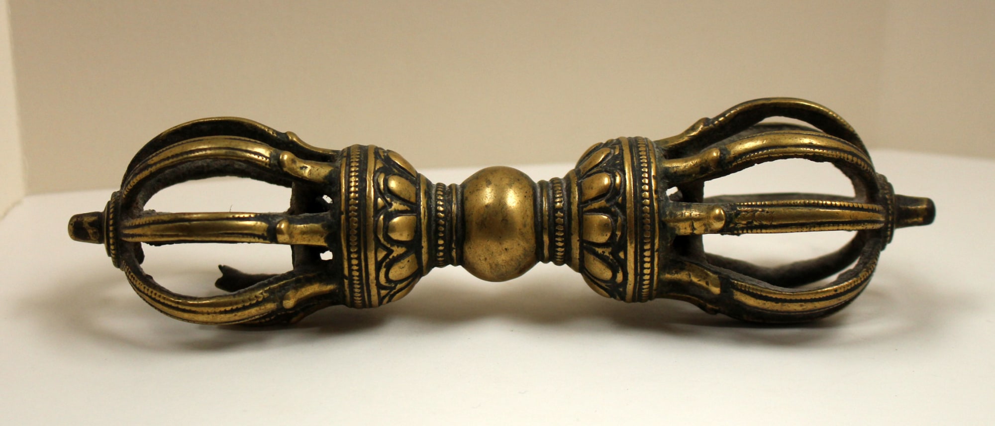 Dorje/Vajra usually is translated as "thunderbolt." In Hinduism it is the weapon of Indra just as is the thunderbolt hurled by Zeus- the King of the Gods in Greek mythology- who uses it to show his aggressive power. But in Tibet the vajra (dorje in Tibetan) translates as “diamond” or “adamantine.” It symbolizes the higher- peaceful truth of that still center of purified consciousness from which all dualities spring- the indestructible diamond-like consciousness of Buddhahood. From the collection of the Dalai Lama’s brother, 1974.