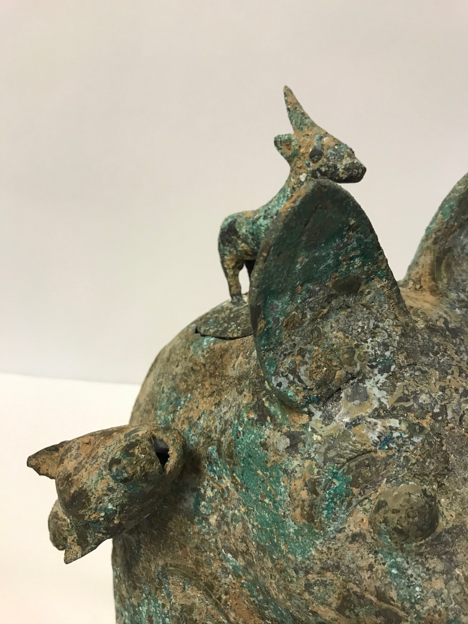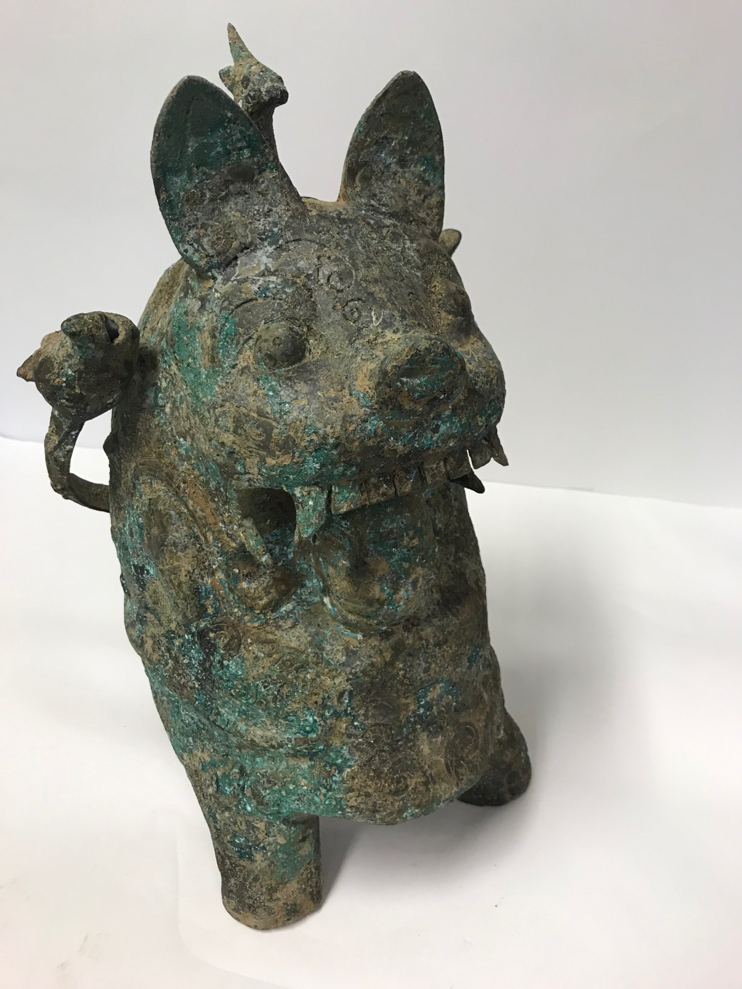 This is a replica of a bronze "you" vessel used to hold liquids for ritual sacrifice, in the form of a tiger with a human head in its jaws. In Chinese tradition, the Tiger is a totemic animal that symbolizes protection. Some interpret the Tiger to be the medium through which the Shaman or Necromancer communicates with Heaven. An explanation of the tiger-human theme from Gilles Béguin, Arts de l’Asie au Musée Cernuschi is: " It may be related to a tradition recorded in the Zuozhuan, an ancient commentary on the Spring and Autumn Annals (8th-5th centuries BC), which describes how the grandson of Ruoao, from the kingdom of Chu, by the name of Ziwen, was adopted and fed by a tigress when he was a child. " Reproduction inspired from Shang Dynasty You Vessels (1600 BCE – 1046 BCE).