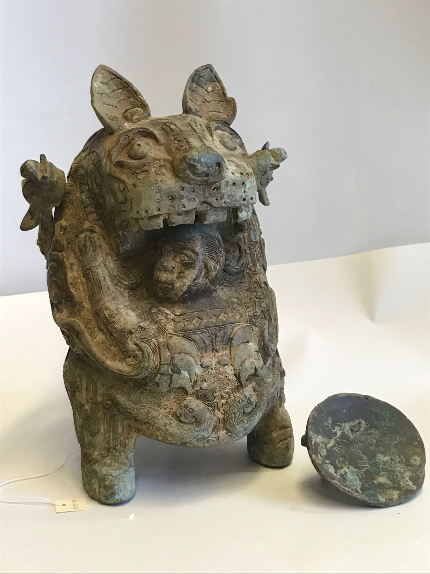 This is a replica of a bronze "you" vessel used to hold liquids for ritual sacrifice, in the form of a tiger with a human head in its jaws. In Chinese tradition, the Tiger is a totemic animal that symbolizes protection. Some interpret the Tiger to be the medium through which the Shaman or Necromancer communicates with Heaven. An explanation of the tiger-human theme from Gilles Béguin, Arts de l’Asie au Musée Cernuschi is: " It may be related to a tradition recorded in the Zuozhuan, an ancient commentary on the Spring and Autumn Annals (8th-5th centuries BC), which describes how the grandson of Ruoao, from the kingdom of Chu, by the name of Ziwen, was adopted and fed by a tigress when he was a child. "
