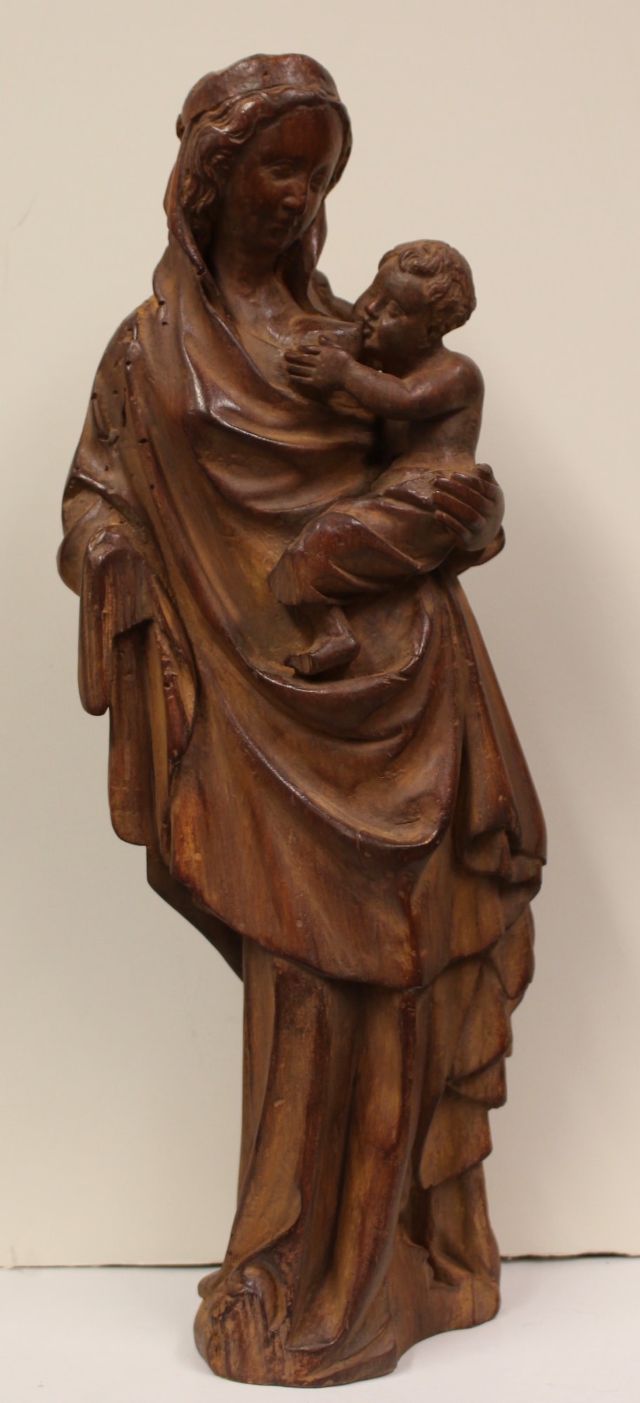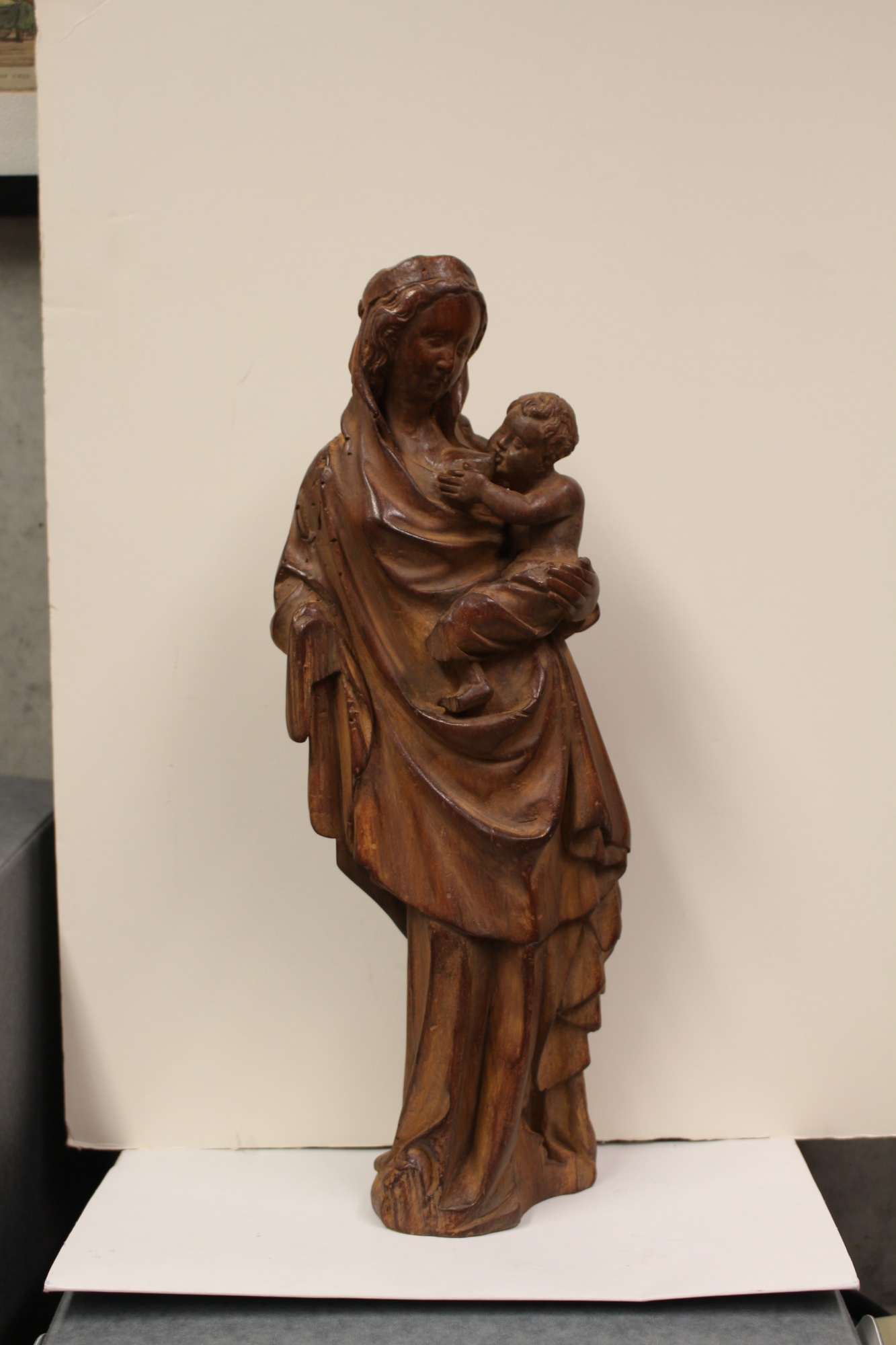 Wooden sculpture of Madonna and Child from France, 14th century. Reproduction.