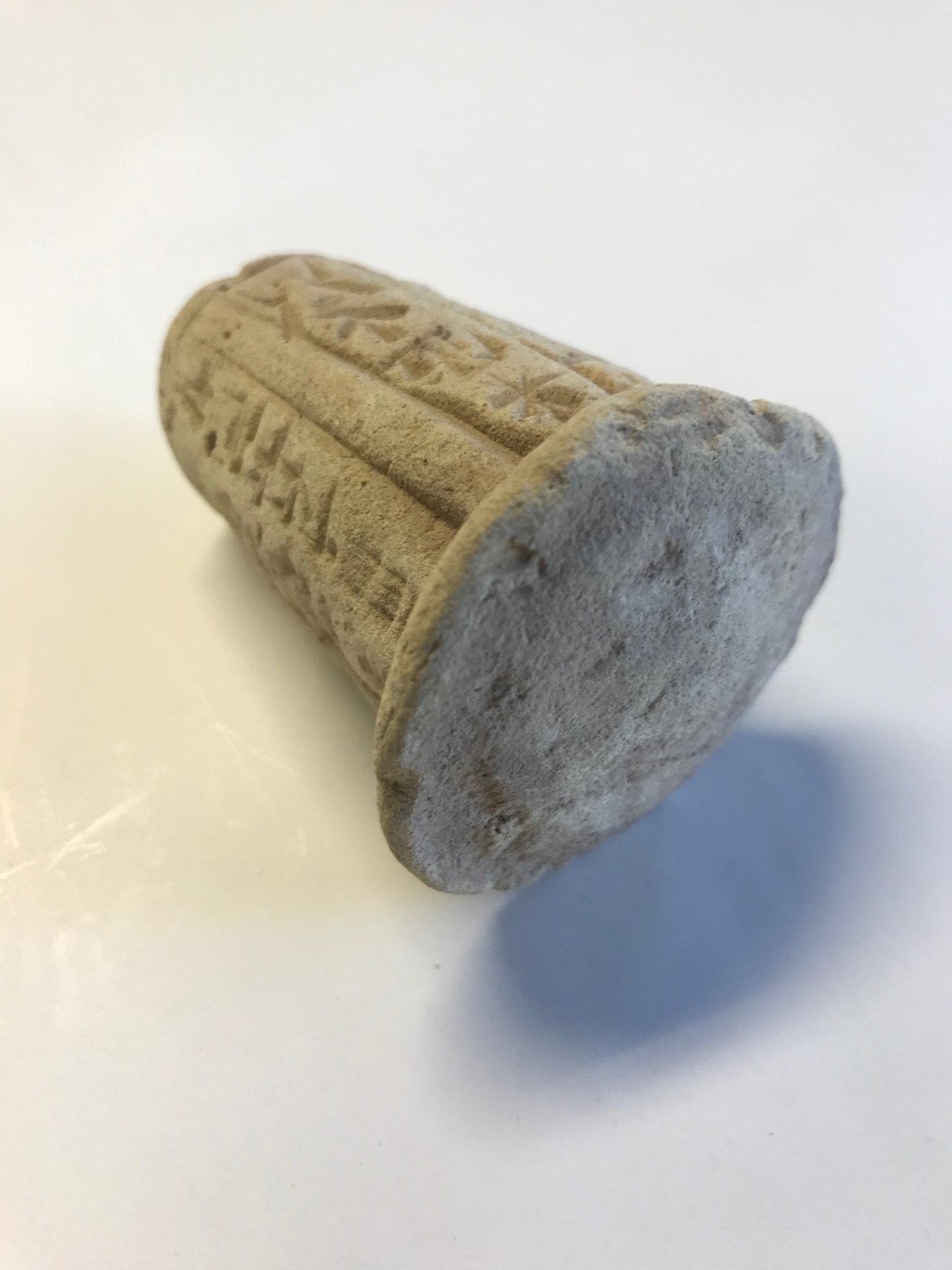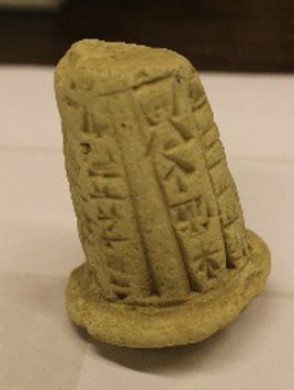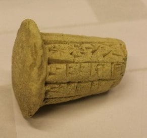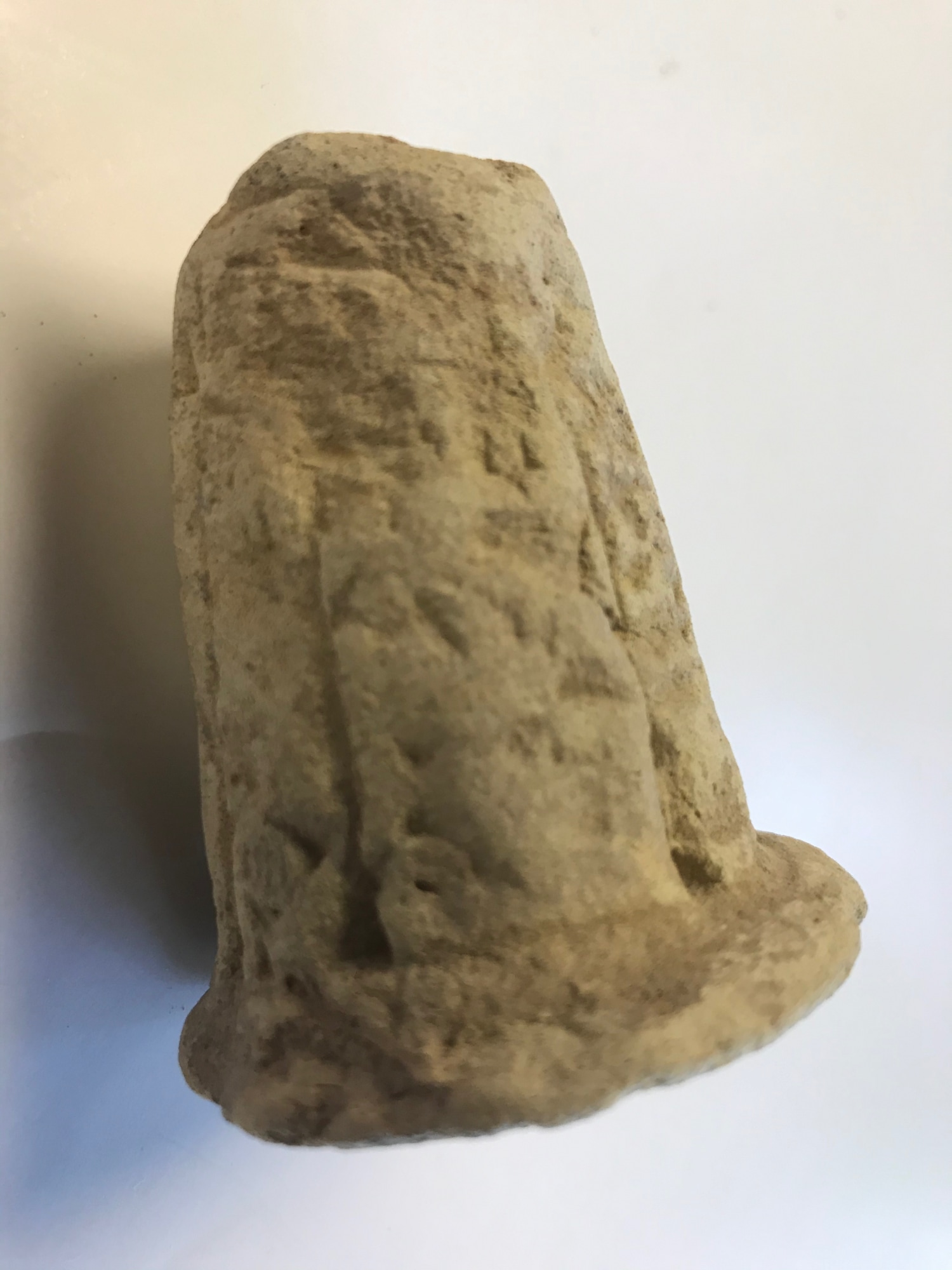 In each of the temples that Gudea built or rebuilt, he placed a cone such as this one inside the walls. A similar tradition continues in the foundation stone of modern construction. Many are of a similar shape and carry a similar inscription which reads: “Gudea built [or restored] this temple for Lord Ningirsu, his Lord.” (FLG)