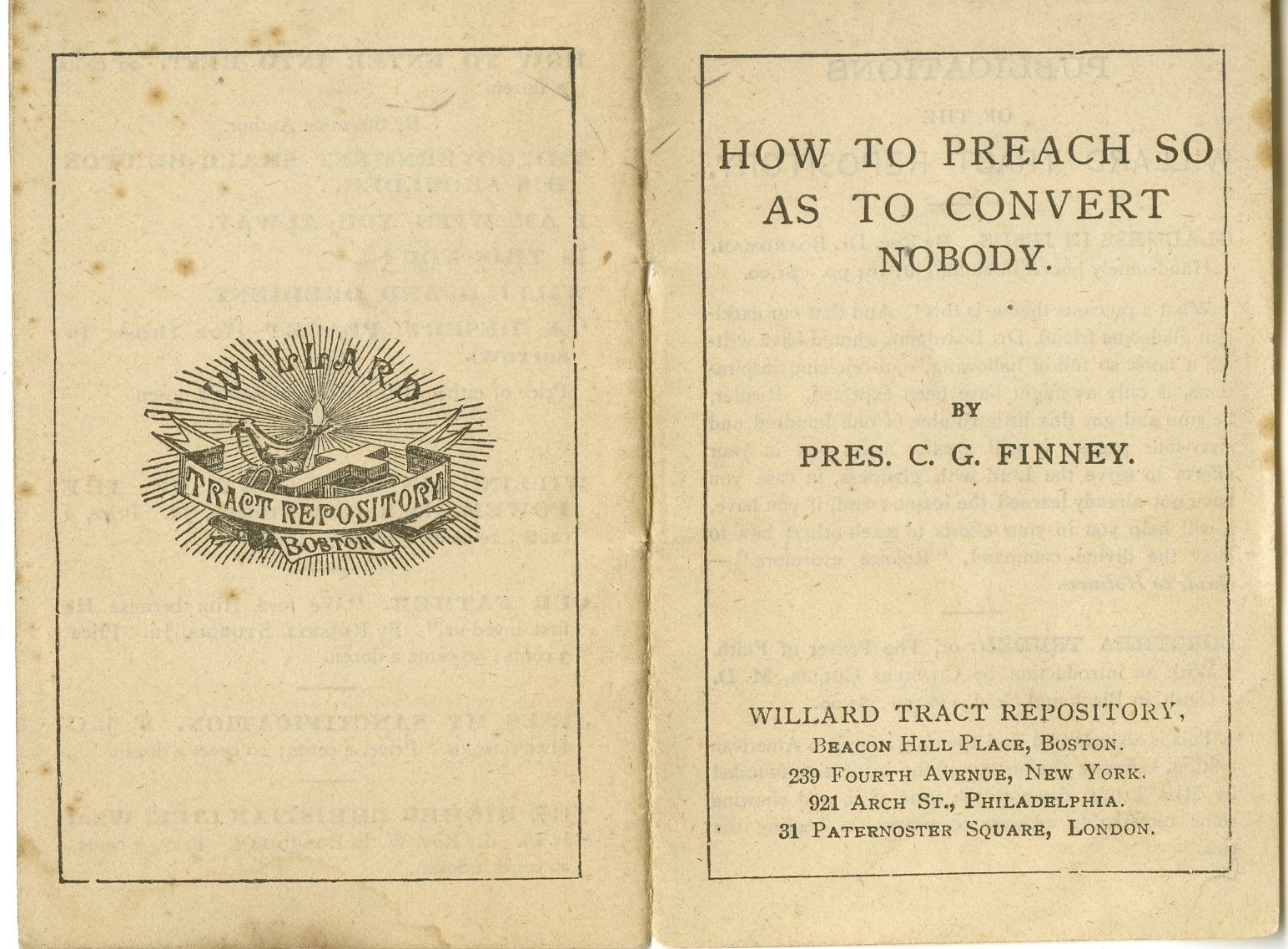 Pres. C.G. Finney, 1792-1875, Williard Tract Repository, Beacon. Circa 1870. One of many Christian tracts published and distributed, some by peddlers. Charles Grandison Finney was a Presbyterian minister and one of the leaders in the Second Great Awakening. He has been called the "Father of Old Revivalism." Beacon Hill Place, Boston.