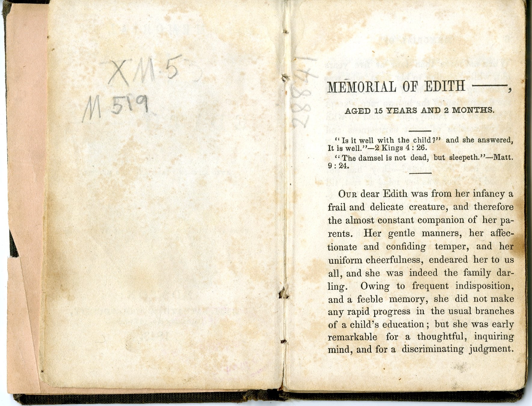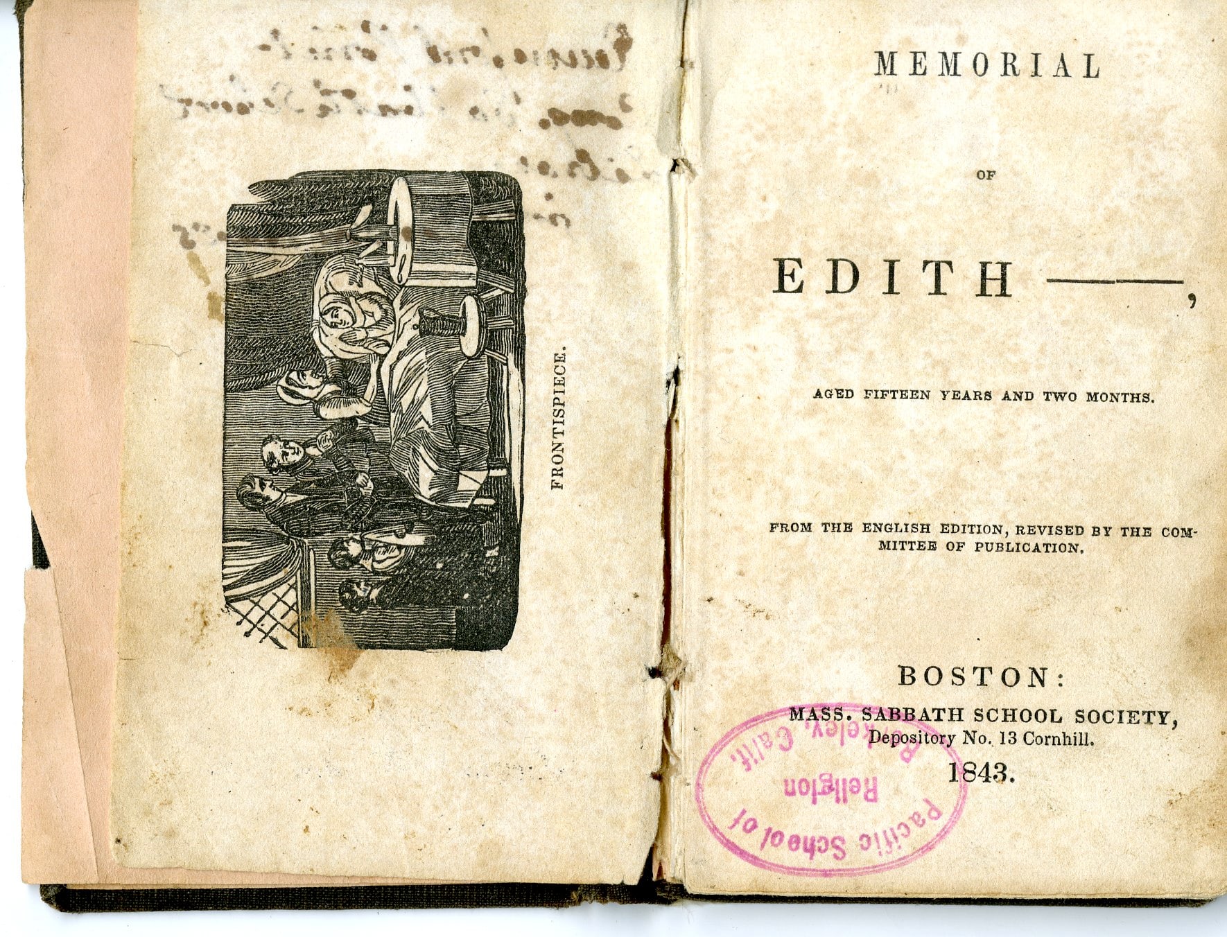 Memorial of Edith, aged fifteen years and two months. Boston: Massachusetts Sabbath School Society, 1843. Series: Infant School Library.