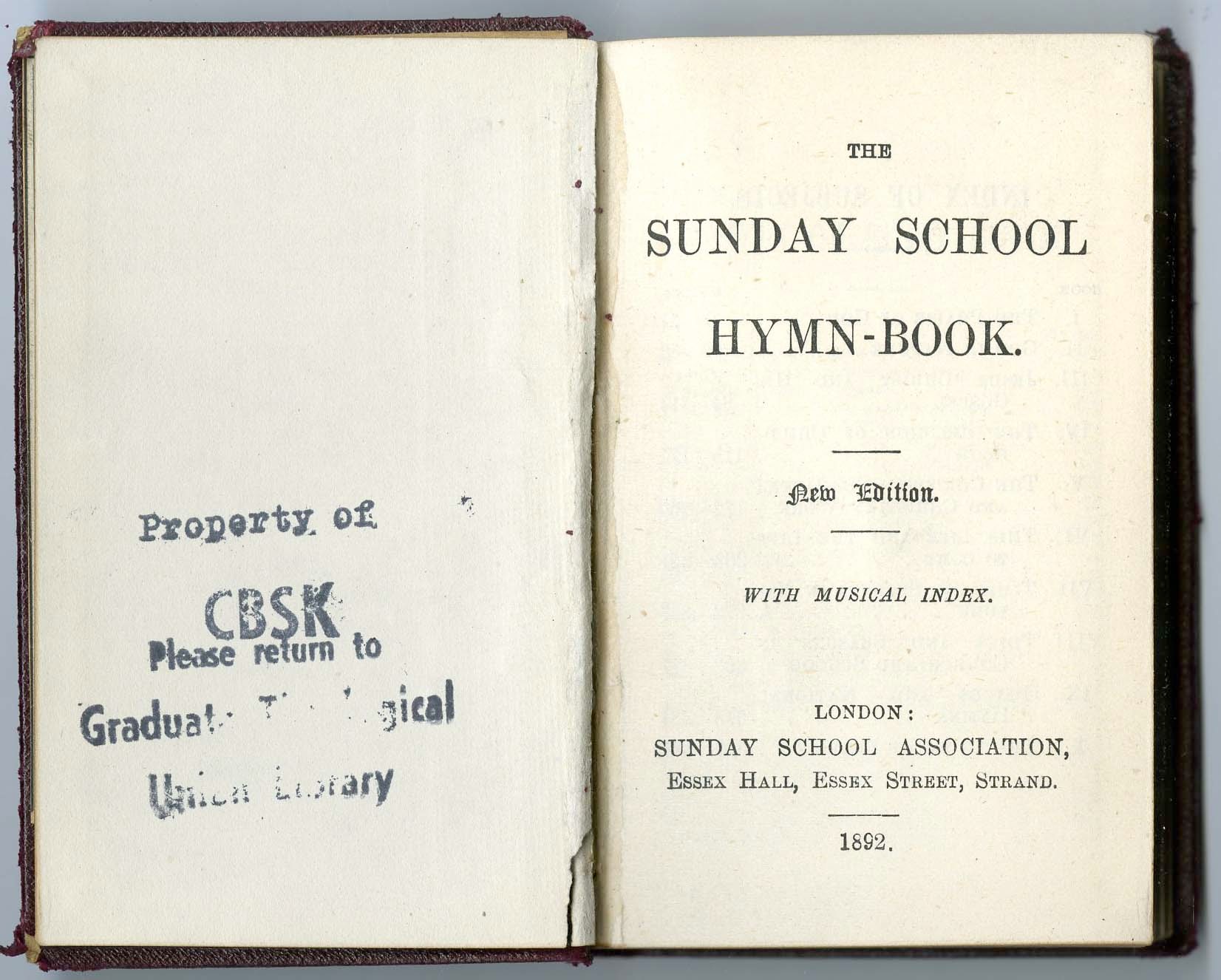 The Sunday school hymn book London: with musical index. London: Sunday School Association, Essex Hall, Essex Street, Strand, 1892. New edition.