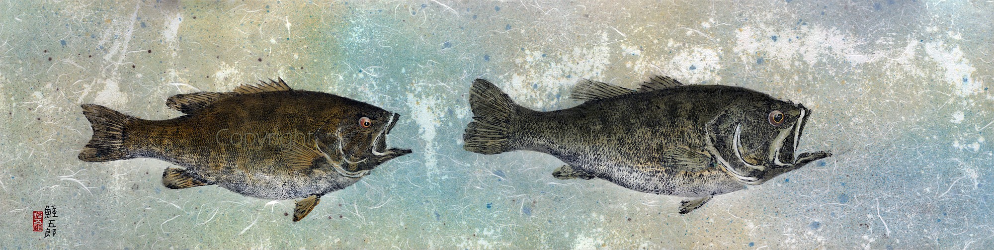This piece is a comparative study of two "black bass" species; the Largemouth Bass (Micropterus salmoides) and the Smallmouth Bass (Micropterus dolomieu)