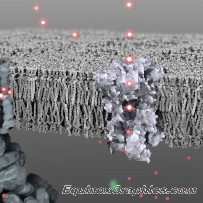 We were hired by BBC Earth to produce a series of three animations to accompany a longform article on the Origins of Life. As this was quite a technical article, the videos were to provide some visual relief, explaining some of the complex concepts more clearly. This still shows ATP, which is used to power every cell. Proton pumps create a concentration gradient, which forces protons through the ATP synthase motor, which turns ADP into ATP, storing energy inside them that can be transported around the cell and used where needed.