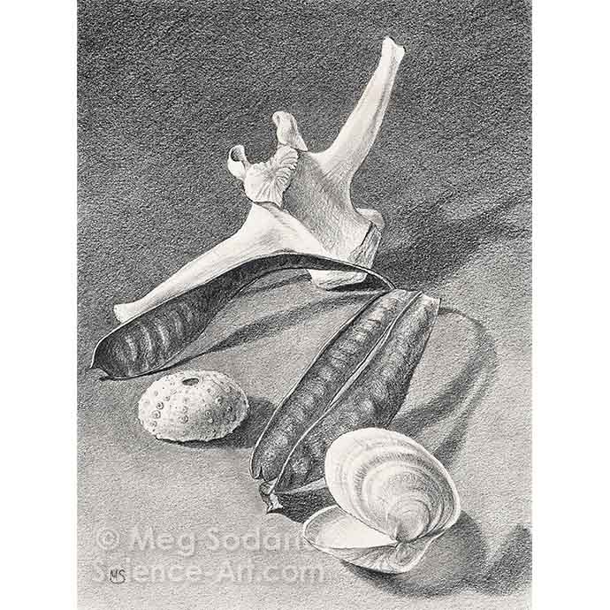 Still life of deer vertebra, seed pods, urchin, and clam shell. Graphite.