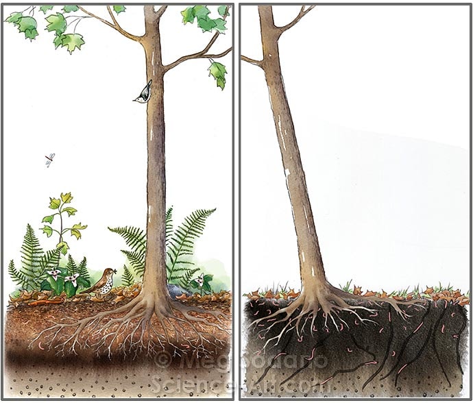 These digital illustrations show the effects of an earthworm invasion in a northern hardwood forest. Invasive earthworms drastically alter the soil's physical and chemical properties, reducing species diversity below and above ground. The entire ecosystem is weakened.