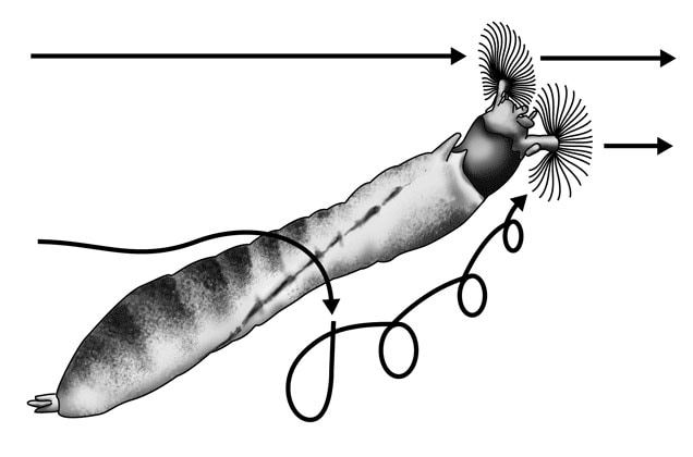 A black fly larvae using turbulence and flow to capture food in its fans.