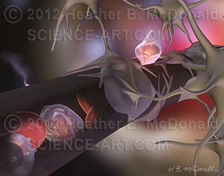 Illustration showing a leukocyte crossing the wall of a small blood vessel and entering the brain in an inflammatory disease state. Created for a News Synthesis article at the Multiple Sclerosis Discovery Forum titled "Gate crashers: Vascular barriers and multiple sclerosis" (2 Apr 2012, www.msdiscovery.org/news/news_synthesis/320-gate-crashers).