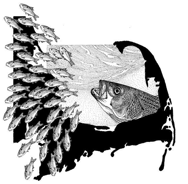 Tee Shirt Design. Cape Cod silhouette, with Pen and Ink Stippled Striped Bass and Juvenile Menhaden.