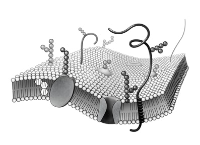 Cell membrane in cross section showing lipid bilayer and transport proteins.