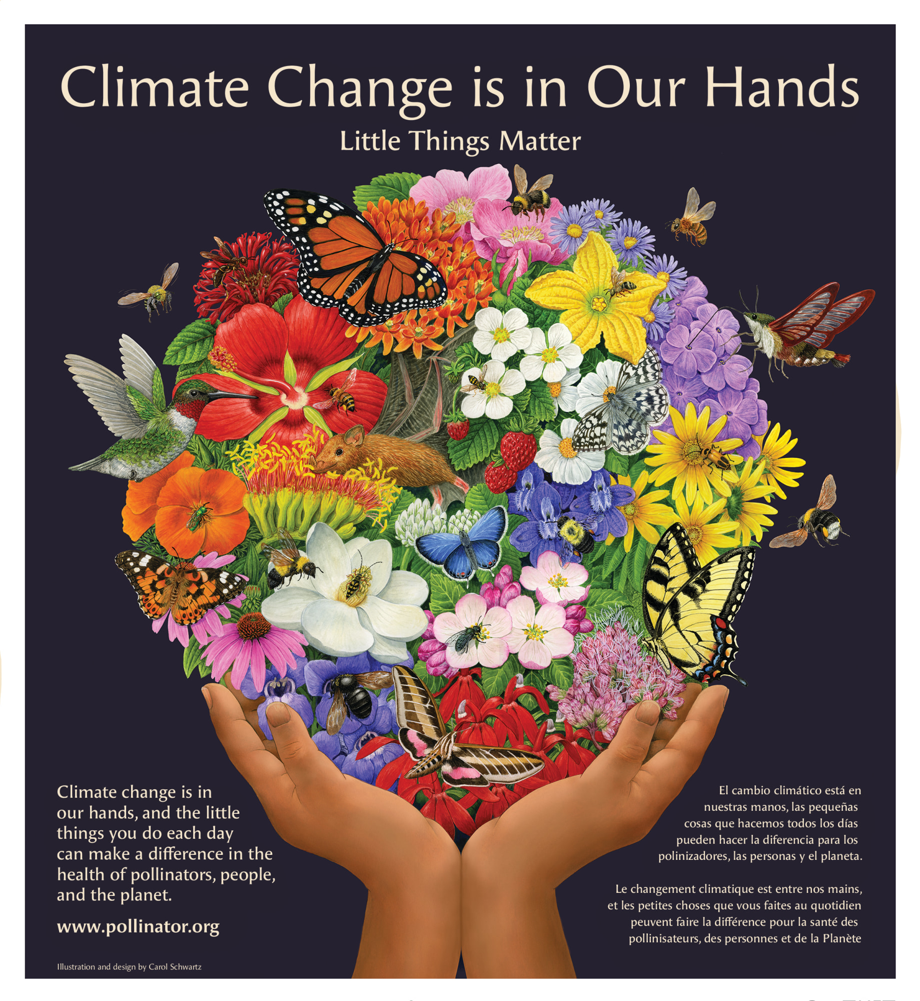 Poster for the Pollinator Partnership showing a variety of pollinators and plants loosely shaped like the Earth being held in a pair of human hands.
