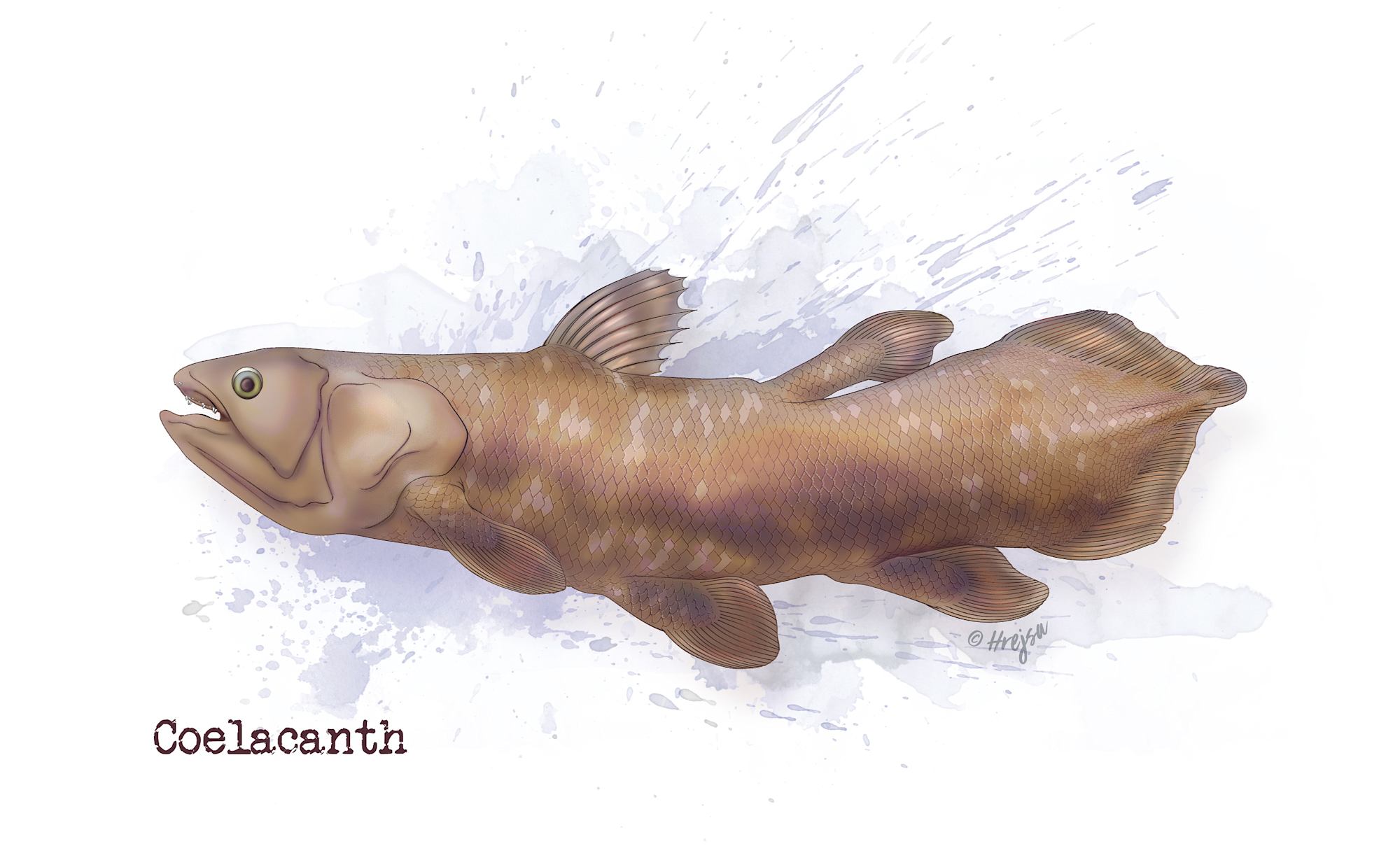 This detailed illustration of the coelacanth, a living fossil, showcases its unique anatomical features. The image highlights the lobed pectoral and pelvic fins, which are crucial for its locomotion in deep-sea environments. The distinct three-lobed tail structure is also depicted, emphasizing its evolutionary significance. This image serves as an educational tool in marine biology and paleontology, aiding in the understanding of vertebrate evolution and anatomy.