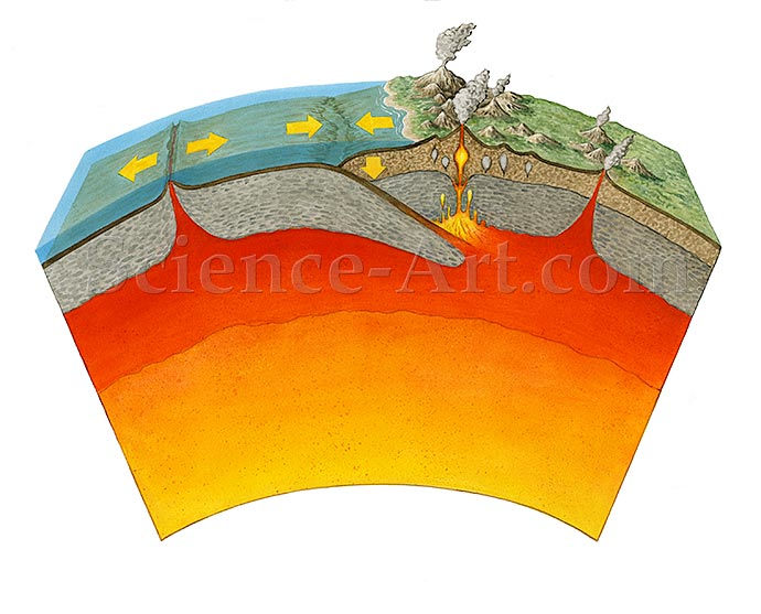 Technical illustration of volcanic action showing convergent boundary.