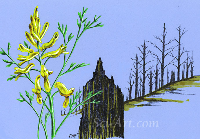 Corydalis aurea rebounds as one of the first flowering plants after severe fires in the Rocky Mountain west.