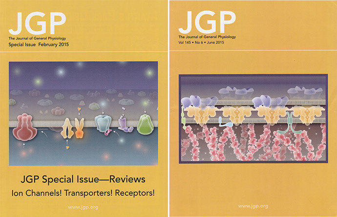 Illustrations for two covers created for The Journal of General Physiology (jgp.rupress.org/), showing a variety of membrane proteins (left) and couplon structures in striated muscle (right); the latter figure is from an article titled "The couplonopathies: A comparative approach to a class of diseases of skeletal and cardiac muscle" [J. Gen. Physiol. 145, 459 (2015). doi: 10.1085/jgp.201411321].
