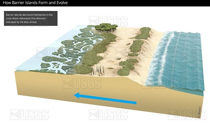 Panel 1 of the barrier island formation and evolution sequence in USGS "Coastal Change at Fire Island" geonarrative, Dynamic Coasts tab. s://wim.usgs.gov/geonarrative/ficc/