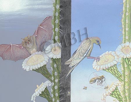 This image touches on the complex pollination of saguaro cacti, occurring both day and night!