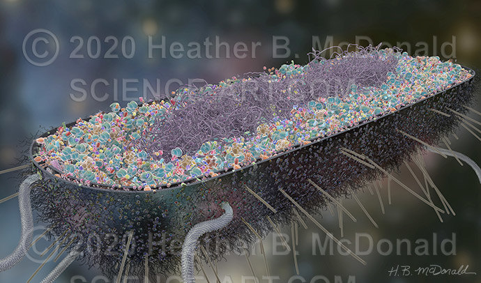 An Escherichia coli bacterial cell split in half to reveal its contents, including an intricate tangle of DNA, numerous ribosomes, and a complex set of intracellular proteins. Modeled using Blender software.