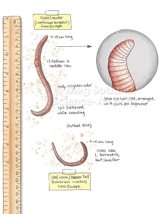 Two species of invasive earthworms are compared. Above is the common nightcrawler (Lumbricus terrestris), and below is the leaf worm (Lumbricus rubellus). These digital illustrations are part of an interactive exhibit about invasive species at Huyck Preserve in Upstate NY.